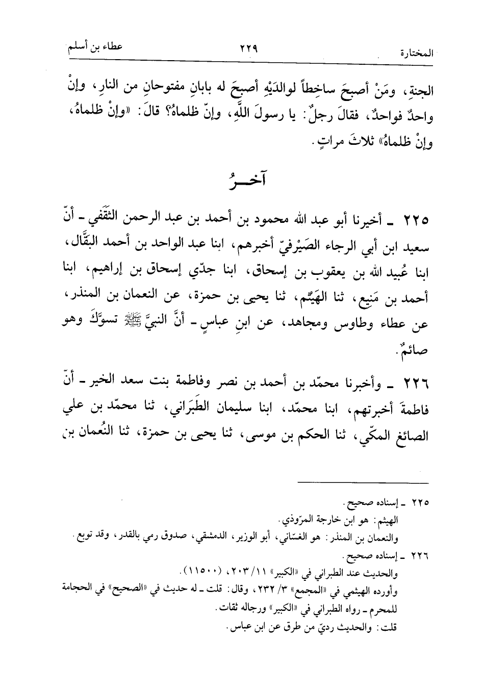 ٢٢٥ - أَخْبَرَنَا أَبُو عَبْدِ اللهِ مَحْمُودُ بْنُ أَحْمَدَ بْنِ عَبْدِ الرَّحْمَنِ الثَّقَفِيُّ، أَنَّ سَعِيدَ بْنَ أَبِي الرَّجَاءِ الصَّيْرَفِيَّ أَخْبَرَهُمْ، أَبْنَا عَبْدُ الْوَاحِدِ بْنُ أَحْمَدَ الْبَقَّالُ، أَبْنَا عُبَيْدُ اللهِ بْنُ يَعْقُوبَ بْنِ إِسْحَاقَ، أَبْنَا جَدِّي إِسْحَاقُ بْنُ إِبْرَاهِيمَ، أَبْنَا أَحْمَدُ بْنُ مَنِيعٍ، ثَنَا الْهَيْثَمُ، ثَنَا يَحْيَى بْنُ حَمْزَةَ، عَنِ النُّعْمَانِ بْنِ الْمُنْذِرِ عَنْ عَطَاءٍ، وَطَاوُسٍ وَمُجَاهِدٍ، عَنِ ابْنِ عَبَّاسٍ، «أَنَّ النَّبِيَّ - صَلَّى اللهُ عَلَيْهِ وَسَلَّمَ - تَسَوَّكَ وَهُوَ صَائِمٌ».