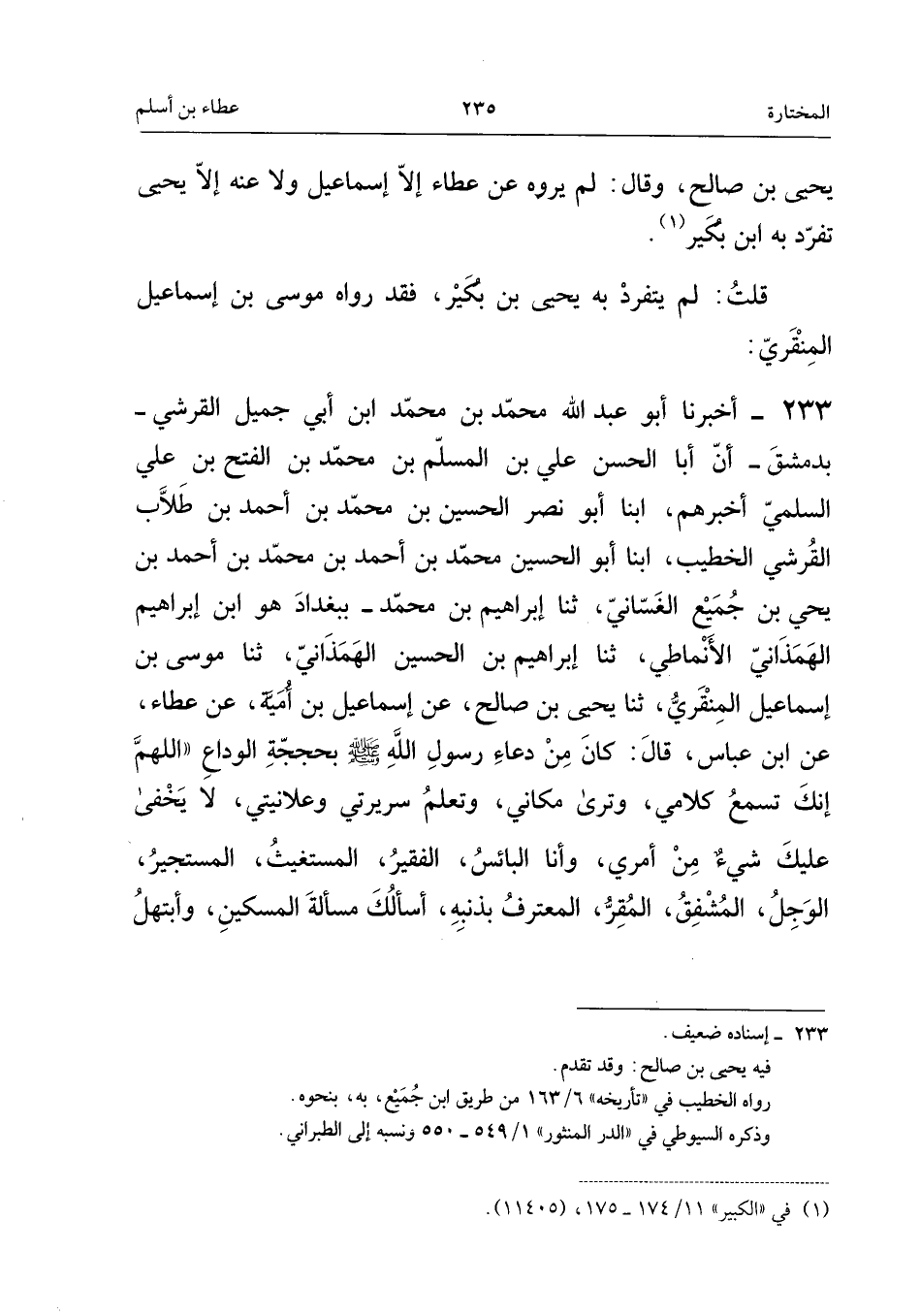 ٢٣٣ - أَخْبَرَنَا أَبُو عَبْدِ اللهِ مُحَمَّدُ بْنُ مُحَمَّدِ بْنِ أَبِي جَمِيلٍ الْقُرَشِيُّ - بِدِمَشْقَ - أَنَّ أَبَا الْحَسَنِ عَلِيَّ بْنَ الْمُسْلِمِ بْنِ مُحَمَّدِ بْنِ الْفَتْحِ بْنِ عَلِيٍّ السُّلَمِيَّ أَخْبَرَهُمْ، أَبْنَا أَبُو نَصْرٍ الْحُسَيْنُ بْنُ مُحَمَّدِ بْنِ أَحْمَدَ بْنِ طَلَّابٍ الْقُرَشِيُّ الْخَطِيبُ، أَبْنَا أَبُو الْحُسَيْنِ مُحَمَّدُ بْنُ أَحْمَدَ بْنِ مُحَمَّدِ بْنِ أَحْمَدَ بْنِ يَحْيَى بْنِ جُمَيْعٍ الْغَسَّانِيُّ، ثَنَا إِبْرَاهِيمُ بْنُ مُحَمَّدٍ - بِبَغْدَادَ - هُوَ ابْنُ إِبْرَاهِيمَ الْهَمَذَانِيُّ الْأَنْمَاطِيُّ، ثَنَا إِبْرَاهِيمُ بْنُ الْحُسَيْنِ الْهَمَذَانِيُّ، ثَنَا مُوسَى بْنُ إِسْمَاعِيلَ الْمِنْقَرِيُّ، ثَنَا يَحْيَى بْنُ صَالِحٍ، عَنْ إِسْمَاعِيلَ بْنِ أُمَيَّةَ، عَنْ عَطَاءٍ، عَنِ ابْنِ عَبَّاسٍ قَالَ: «كَانَ مِنْ دُعَاءِ رَسُولِ اللهِ - صَلَّى اللهُ عَلَيْهِ وَسَلَّمَ - بِحَجَّةِ الْوَدَاعِ اللَّهُمَّ إِنَّكَ تَسْمَعُ كَلَامِي، وَتَرَى مَكَانِي، وَتَعْلَمُ سَرِيرَتِي وَعَلَانِيَتِي، لَا يَخْفَى عَلَيْكَ شَيْءٌ مِنْ أَمْرِي، وَأَنَا الْبَائِسُ الْفَقِيرُ، الْمُسْتَغِيثُ الْمُسْتَجِيرُ، الْوَجِلُ الْمُشْفِقُ، الْمُقِرُّ الْمُعْتَرِفُ بِذَنْبِهِ، أَسْأَلُكَ مَسْأَلَةَ الْمِسْكِينِ، وَأَبْتَهِلُ
