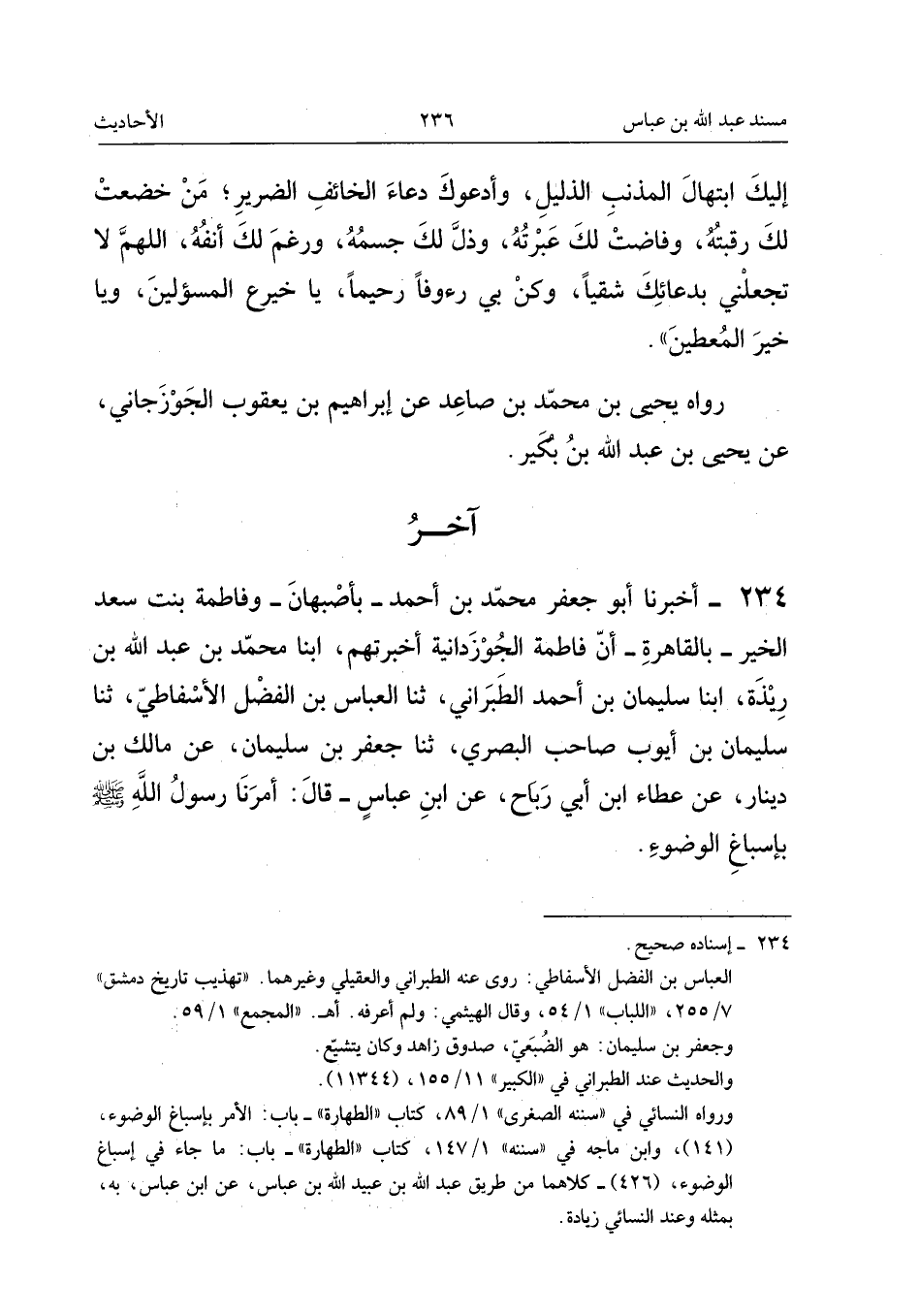 ٢٣٤ - أَخْبَرَنَا أَبُو جَعْفَرٍ مُحَمَّدُ بْنُ أَحْمَدَ - بِأَصْبَهَانَ - وَفَاطِمَةُ بِنْتُ سَعْدِ الْخَيْرِ - بِالْقَاهِرَةِ - أَنَّ فَاطِمَةَ الْجُوزْدَانِيَّةَ أَخْبَرَتْهُمْ، أَبْنَا مُحَمَّدُ بْنُ عَبْدِ اللهِ بْنِ رِيذَةَ، أَبْنَا سُلَيْمَانُ بْنُ أَحْمَدَ الطَّبَرَانِيُّ، ثَنَا الْعَبَّاسُ بْنُ الْفَضْلِ الْأَسْفَاطِيُّ، ثَنَا سُلَيْمَانُ بْنُ أَيُّوبَ صَاحِبُ الْبَصْرِيِّ، ثَنَا جَعْفَرُ بْنُ سُلَيْمَانَ، عَنْ مَالِكِ بْنِ دِينَارٍ، عَنْ عَطَاءِ بْنِ أَبِي رَبَاحٍ، عَنِ ابْنِ عَبَّاسٍ قَالَ: «أَمَرَنَا رَسُولُ اللهِ - صَلَّى اللهُ عَلَيْهِ وَسَلَّمَ - بِإِسْبَاغِ الْوُضُوءِ».
