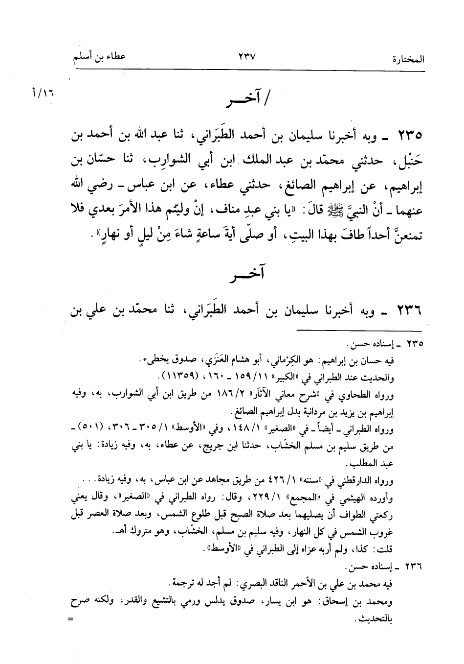 ٢٣٥ - وَبِهِ أَخْبَرَنَا سُلَيْمَانُ بْنُ أَحْمَدَ الطَّبَرَانِيُّ، ثَنَا عَبْدُ اللهِ بْنُ أَحْمَدَ بْنِ حَنْبَلٍ، حَدَّثَنِي مُحَمَّدُ بْنُ عَبْدِ الْمَلِكِ بْنِ أَبِي الشَّوَارِبِ، ثَنَا حَسَّانُ بْنُ إِبْرَاهِيمَ، عَنْ إِبْرَاهِيمَ الصَّائِغِ، حَدَّثَنِي عَطَاءٌ، عَنِ ابْنِ عَبَّاسٍ - رَضِيَ اللهُ عَنْهُمَا - أَنَّ النَّبِيَّ - صَلَّى اللهُ عَلَيْهِ وَسَلَّمَ - قَالَ: «يَا بَنِي عَبْدِ مَنَافٍ، إِنْ وُلِّيتُمْ هَذَا الْأَمْرَ بَعْدِي فَلَا تَمْنَعُنَّ أَحَدًا طَافَ بِهَذَا الْبَيْتِ، أَوْ صَلَّى أَيَّةَ سَاعَةٍ شَاءَ مِنْ لَيْلٍ أَوْ نَهَارٍ».