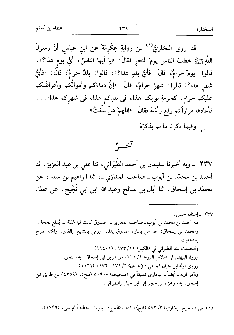 ٢٣٧ - وَبِهِ أَخْبَرَنَا سُلَيْمَانُ بْنُ أَحْمَدَ الطَّبَرَانِيُّ، ثَنَا عَلِيُّ بْنُ عَبْدِ الْعَزِيزِ، ثَنَا أَحْمَدُ بْنُ مُحَمَّدِ بْنِ أَيُّوبَ - صَاحِبُ الْمَغَازِي - ثَنَا إِبْرَاهِيمُ بْنُ سَعْدٍ عَنْ مُحَمَّدِ بْنِ إِسْحَاقَ، ثَنَا أَبَانُ بْنُ صَالِحٍ وَعَبْدُ اللهِ بْنُ أَبِي نَجِيحٍ، عَنْ عَطَاءِ