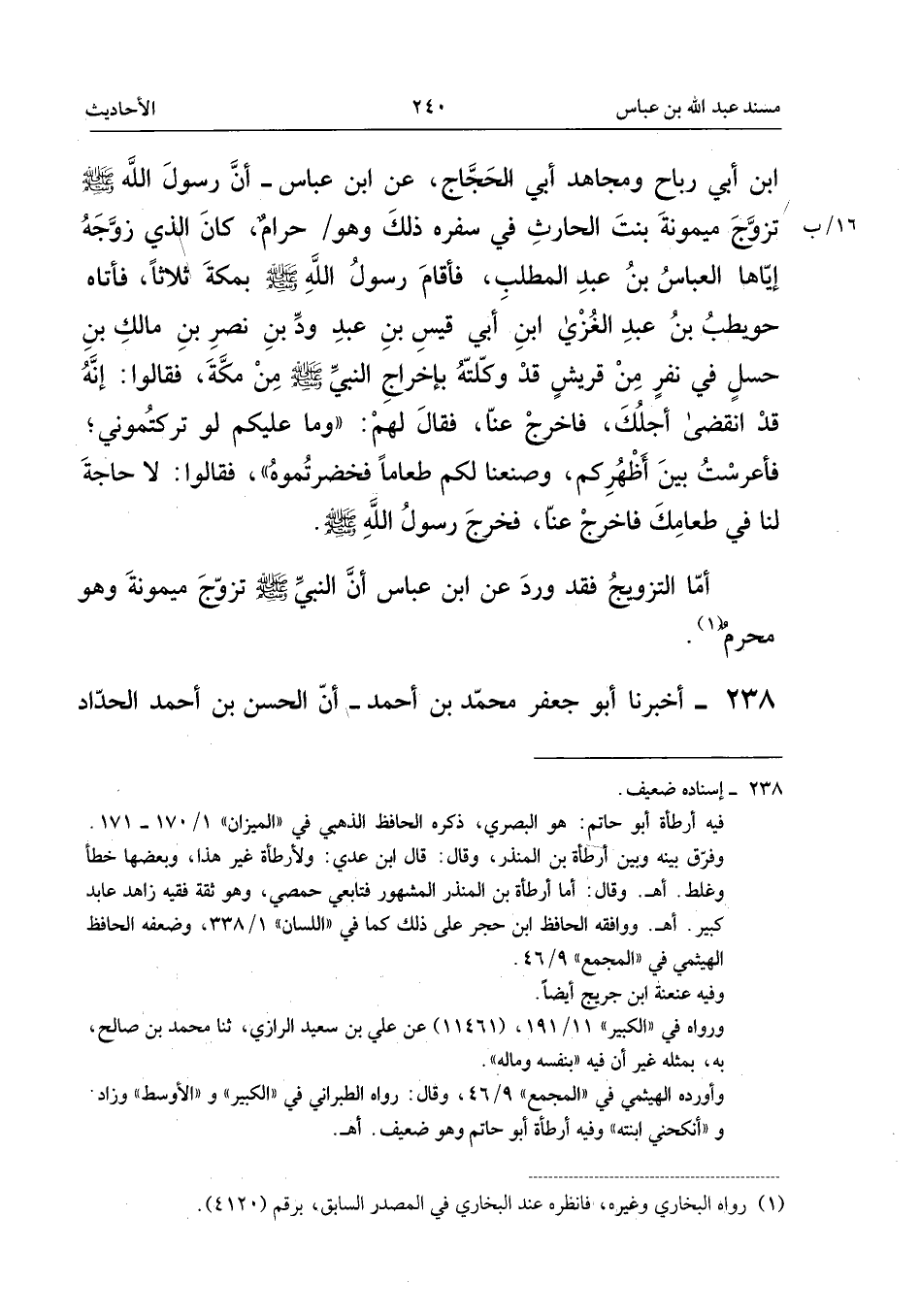 أَخْبَرَهُمْ - قِرَاءَةً عَلَيْهِ وَهُوَ حَاضِرٌ - أَبْنَا أَبُو نُعَيْمٍ أَحْمَدُ بْنُ عَبْدِ اللهِ، أَبْنَا سُلَيْمَانُ بْنُ أَحْمَدَ الطَّبَرَانِيُّ، ثَنَا أَحْمَدُ بْنُ الْقَاسِمِ بْنِ مُسَاوِرٍ، ثَنَا مُحَمَّدُ بْنُ صَالِحِ بْنِ النَّطَّاحِ، ثَنَا أَرْطَاةُ أَبُو حَاتِمٍ ثَنَا ابْنُ جُرَيْجٍ، عَنْ عَطَاءٍ، عَنِ ابْنِ عَبَّاسٍ قَالَ: قَالَ رَسُولُ اللهِ - صَلَّى اللهُ عَلَيْهِ وَسَلَّمَ -: «مَا أَحَدٌ أَعْظَمُ عِنْدِي يَدًا مِنْ أَبِي بَكْرٍ، وَاسَانِي بِمَالِهِ، وَنَفْسِهِ، وَأَنْكَحَنِي ابْنَتَهُ».