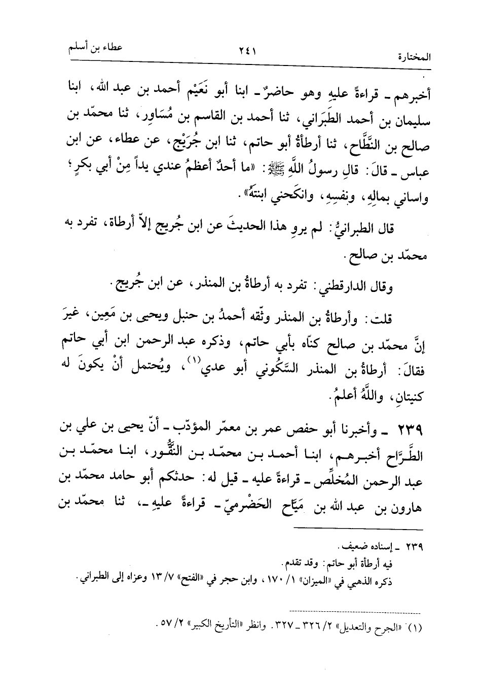 صَالِحِ بْنِ النَّطَّاحِ، حَدَّثَنِي أَرْطَاةُ أَبُو حَاتِمٍ، عَنِ ابْنِ جُرَيْجٍ، عَنْ عَطَاءٍ، عَنِ ابْنِ عَبَّاسٍ قَالَ: قَالَ رَسُولُ اللهِ - صَلَّى اللهُ عَلَيْهِ وَسَلَّمَ -: «مَا أَحَدٌ عِنْدِي أَعْظَمُ يَدًا مِنْ أَبِي بَكْرٍ - رَحْمَةُ اللهِ عَلَيْهِ - وَاسَانِي بِنَفْسِهِ، وَمَالِهِ، وَأَنْكَحَنِي ابْنَتَهُ».