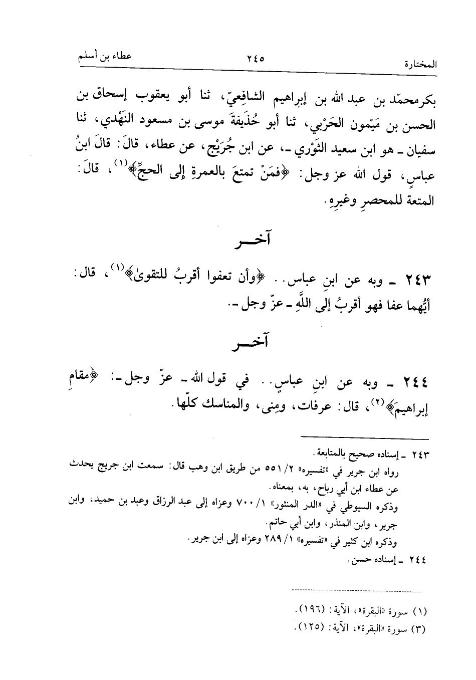 ٢٤٤ - وَبِهِ عَنِ ابْنِ عَبَّاسٍ: «فِي قَوْلِ اللهِ - عَزَّ وَجَلَّ -: {مَقَامِ إِبْرَاهِيمَ}، قَالَ: عَرَفَاتٌ، وَمِنًى، وَالْمَنَاسِكُ كُلُّهَا».