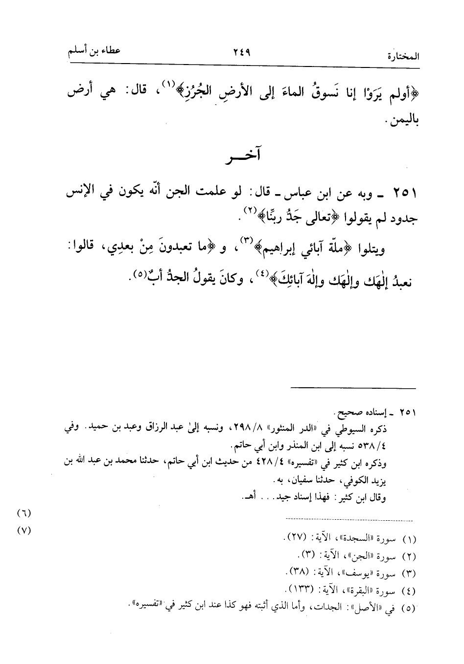 ٢٥١ - وَبِهِ، عَنِ ابْنِ عَبَّاسٍ قَالَ: «لَوْ عَلِمَتِ الْجِنُّ أَنَّهُ يَكُونُ فِي الْإِنْسِ جُدُودٌ لَمْ يَقُولُوا: {تَعَالَى جَدُّ رَبِّنَا}.