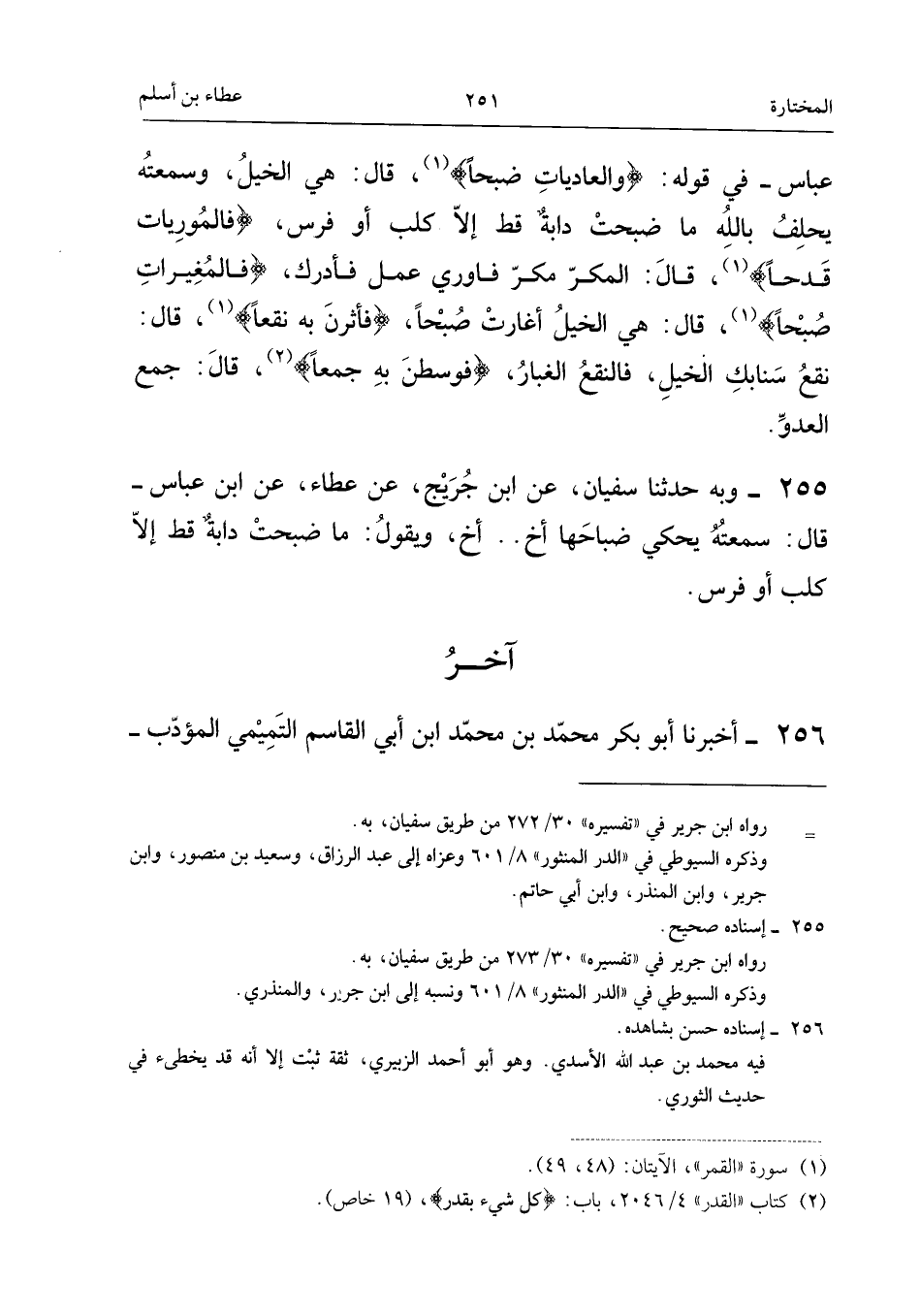 ٢٥٥ - وَبِهِ حَدَّثَنَا سُفْيَانُ، عَنِ ابْنِ جُرَيْجٍ، عَنْ عَطَاءٍ عَنِ ابْنِ عَبَّاسٍ قَالَ: «سَمِعْتُهُ يَحْكِي ضِبَاحَهَا أَخْ أَخْ، وَيَقُولُ: مَا ضَبَحَتْ دَابَّةٌ قَطُّ إِلَّا كَلْبٌ أَوْ فَرَسٌ».