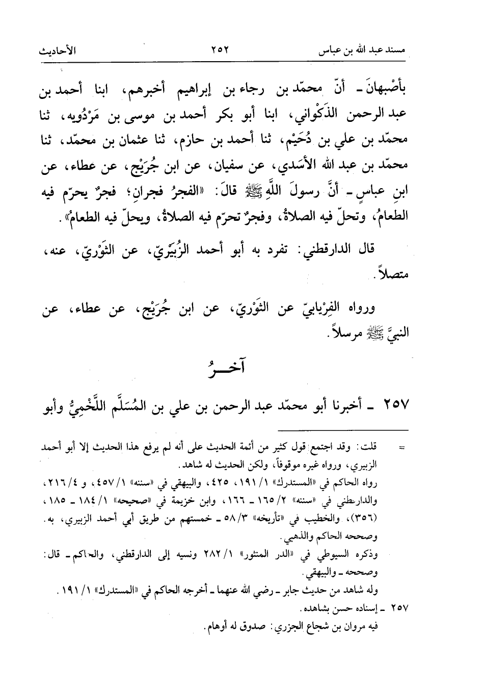 طَاهِرٍ بَرَكَاتُ بْنُ إِبْرَاهِيمَ بْنِ طَاهِرِ بْنِ بَرَكَاتٍ الْقُرَشِيُّ - قِرَاءَةً عَلَى كُلِّ وَاحِدٍ مِنْهُمَا بِدِمَشْقَ - أَنَّ عَبْدَ الْكَرِيمِ بْنَ حَمْزَةَ بْنِ الْخَضِرِ السُّلَمِيَّ أَخْبَرَهُمْ، أَبْنَا أَبُو الْقَاسِمِ الْحُسَيْنُ بْنُ مُحَمَّدِ بْنِ إِبْرَاهِيمَ الْحِنَّائِيُّ، أَبْنَا عَبْدُ اللهِ بْنُ مُحَمَّدٍ الْحِنَّائِيُّ، ثَنَا إِسْمَاعِيلُ بْنُ مُحَمَّدٍ الصَّفَّارُ، ثَنَا الْحَسَنُ بْنُ عَرَفَةَ، ثَنَا مَرْوَانُ بْنُ شُجَاعٍ الْجَزَرِيُّ، عَنْ عَبْدِ الْمَلِكِ بْنِ جُرَيْجٍ، عَنْ عَطَاءِ بْنِ أَبِي رَبَاحٍ قَالَ: أَتَيْتُ ابْنَ عَبَّاسٍ (حَ).