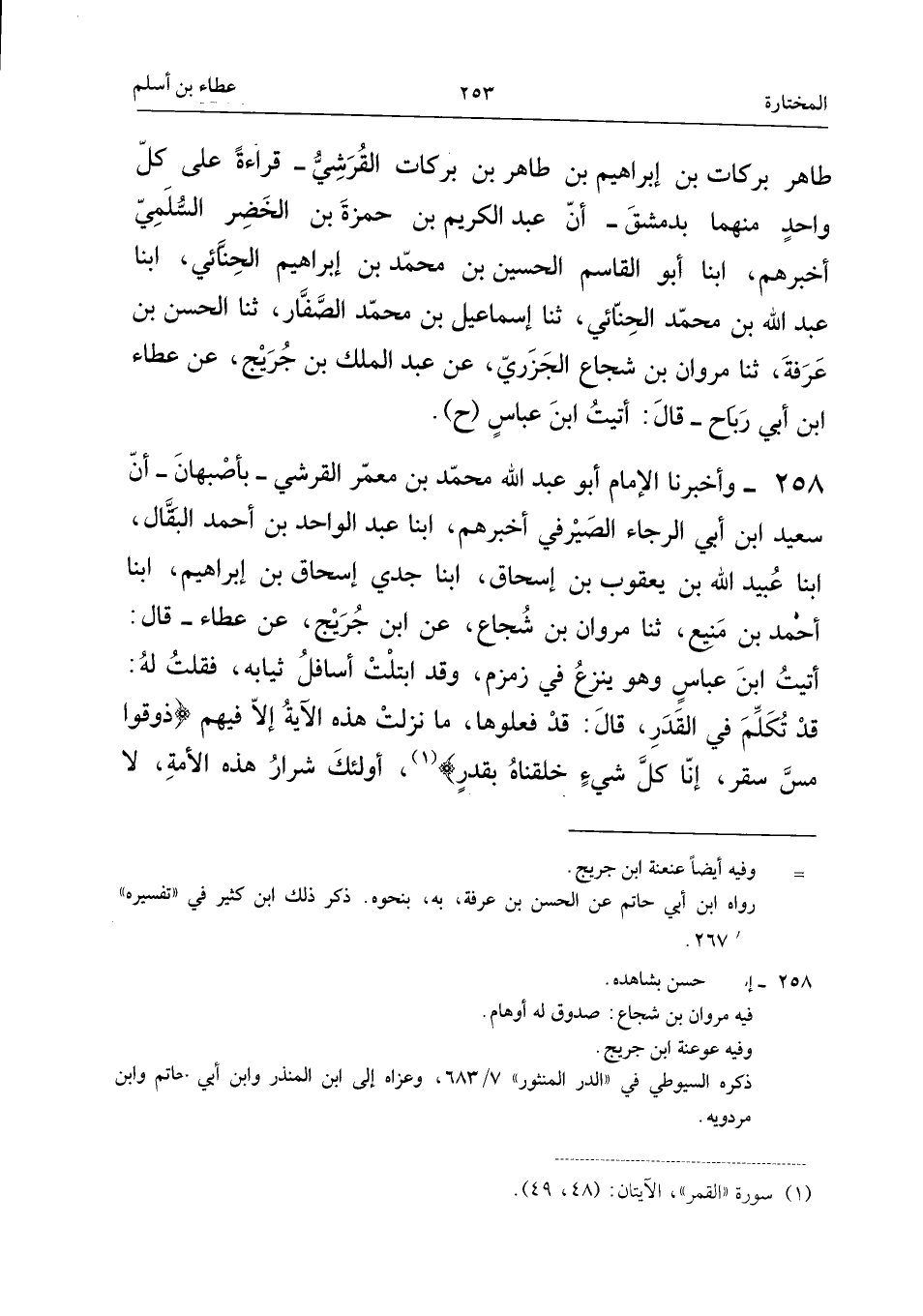 ٢٥٨ - وَأَخْبَرَنَا الْإِمَامُ أَبُو عَبْدِ اللهِ مُحَمَّدُ بْنُ مَعْمَرٍ الْقُرَشِيُّ - بِأَصْبَهَانَ - أَنَّ سَعِيدَ بْنَ أَبِي الرَّجَاءِ الصَّيْرَفِيَّ أَخْبَرَهُمْ، أَبْنَا عَبْدُ الْوَاحِدِ بْنُ أَحْمَدَ الْبَقَّالُ، أَبْنَا عُبَيْدُ اللهِ بْنُ يَعْقُوبَ بْنِ إِسْحَاقَ، أَبْنَا جَدِّي إِسْحَاقُ بْنُ إِبْرَاهِيمَ، أَبْنَا أَحْمَدُ بْنُ مَنِيعٍ، ثَنَا مَرْوَانُ بْنُ شُجَاعٍ، عَنِ ابْنِ جُرَيْجٍ، عَنْ عَطَاءٍ قَالَ: «أَتَيْتُ ابْنَ عَبَّاسٍ وَهُوَ يَنْزِعُ فِي زَمْزَمَ، وَقَدِ ابْتَلَّتْ أَسَافِلُ ثِيَابِهِ، فَقُلْتُ لَهُ: قَدْ تُكُلِّمَ فِي الْقَدَرِ، قَالَ: قَدْ فَعَلُوهَا؟ مَا نَزَلَتْ هَذِهِ الْآيَةُ إِلَّا فِيهِمْ: {ذُوقُوا مَسَّ سَقَرَ * إِنَّا كُلَّ شَيْءٍ خَلَقْنَاهُ بِقَدَرٍ}، أُولَئِكَ شِرَارُ هَذِهِ الْأُمَّةِ، لَا