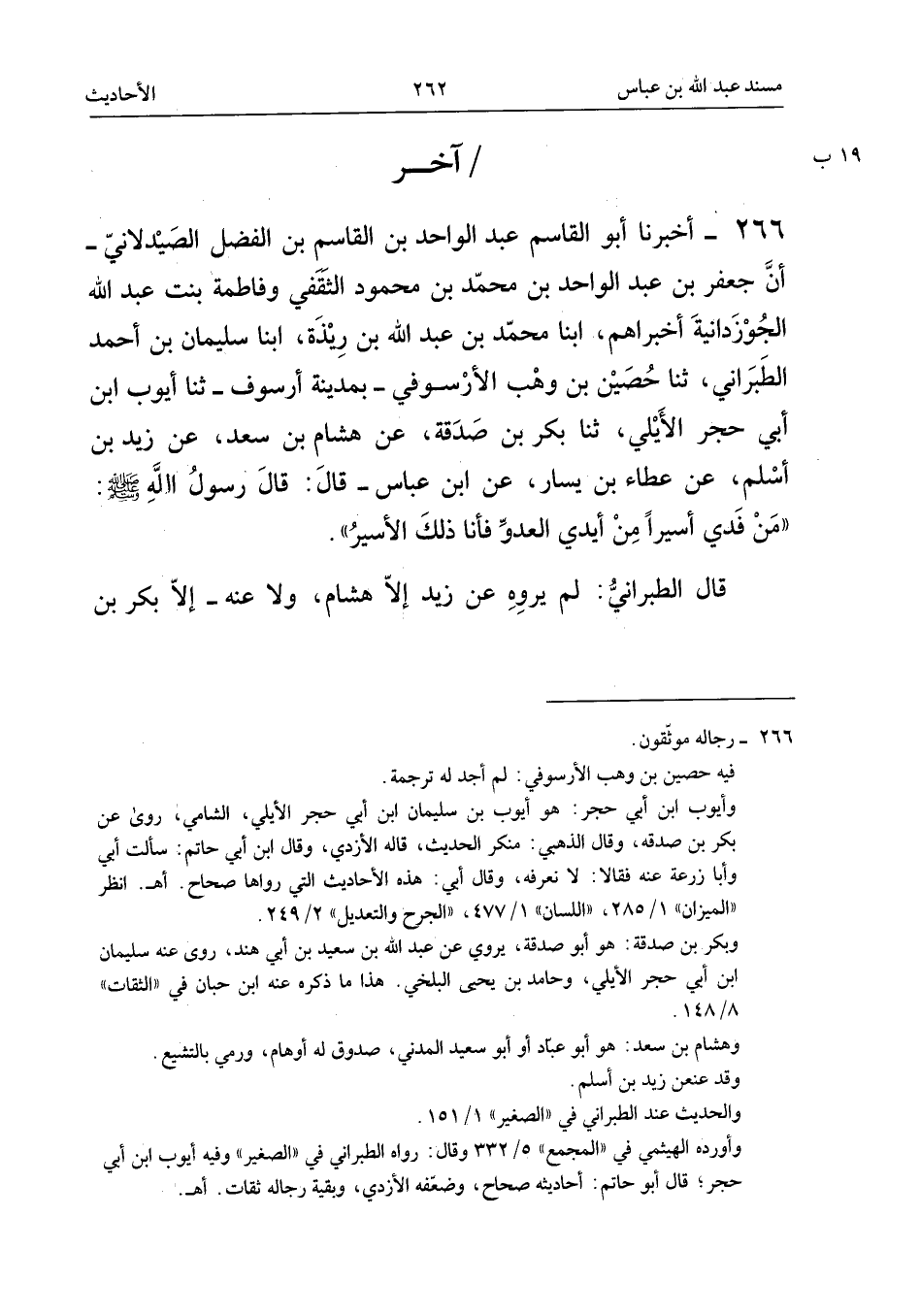 ٢٦٦ - أَخْبَرَنَا أَبُو الْقَاسِمِ عَبْدُ الْوَاحِدِ بْنُ الْقَاسِمِ بْنِ الْفَضْلِ الصَّيْدَلَانِيُّ، أَنَّ جَعْفَرَ بْنَ عَبْدِ الْوَاحِدِ بْنِ مُحَمَّدِ بْنِ مَحْمُودٍ الثَّقَفِيَّ وَفَاطِمَةَ بِنْتَ عَبْدِ اللهِ الْجُوزْدَانِيَّةَ أَخْبَرَاهُمْ، أَبْنَا مُحَمَّدُ بْنُ عَبْدِ اللهِ بْنِ رِيذَةَ، أَبْنَا سُلَيْمَانُ بْنُ أَحْمَدَ الطَّبَرَانِيُّ، ثَنَا حُصَيْنُ بْنُ وَهْبٍ الْأُرْسُوفِيُّ - بِمَدِينَةِ أُرْسُوفَ - ثَنَا أَيُّوبُ بْنُ أَبِي حُجْرٍ الْأَيْلِيُّ، ثَنَا بَكْرُ بْنُ صَدَقَةَ، عَنْ هِشَامِ بْنِ سَعْدٍ، عَنْ زَيْدِ بْنِ أَسْلَمَ، عَنْ عَطَاءِ بْنِ يَسَارٍ، عَنِ ابْنِ عَبَّاسٍ قَالَ: قَالَ رَسُولُ اللهِ - صَلَّى اللهُ عَلَيْهِ وَسَلَّمَ -: «مَنْ فَدَى أَسِيرًا مِنْ أَيْدِي الْعَدُوِّ فَأَنَا ذَلِكَ الْأَسِيرُ».