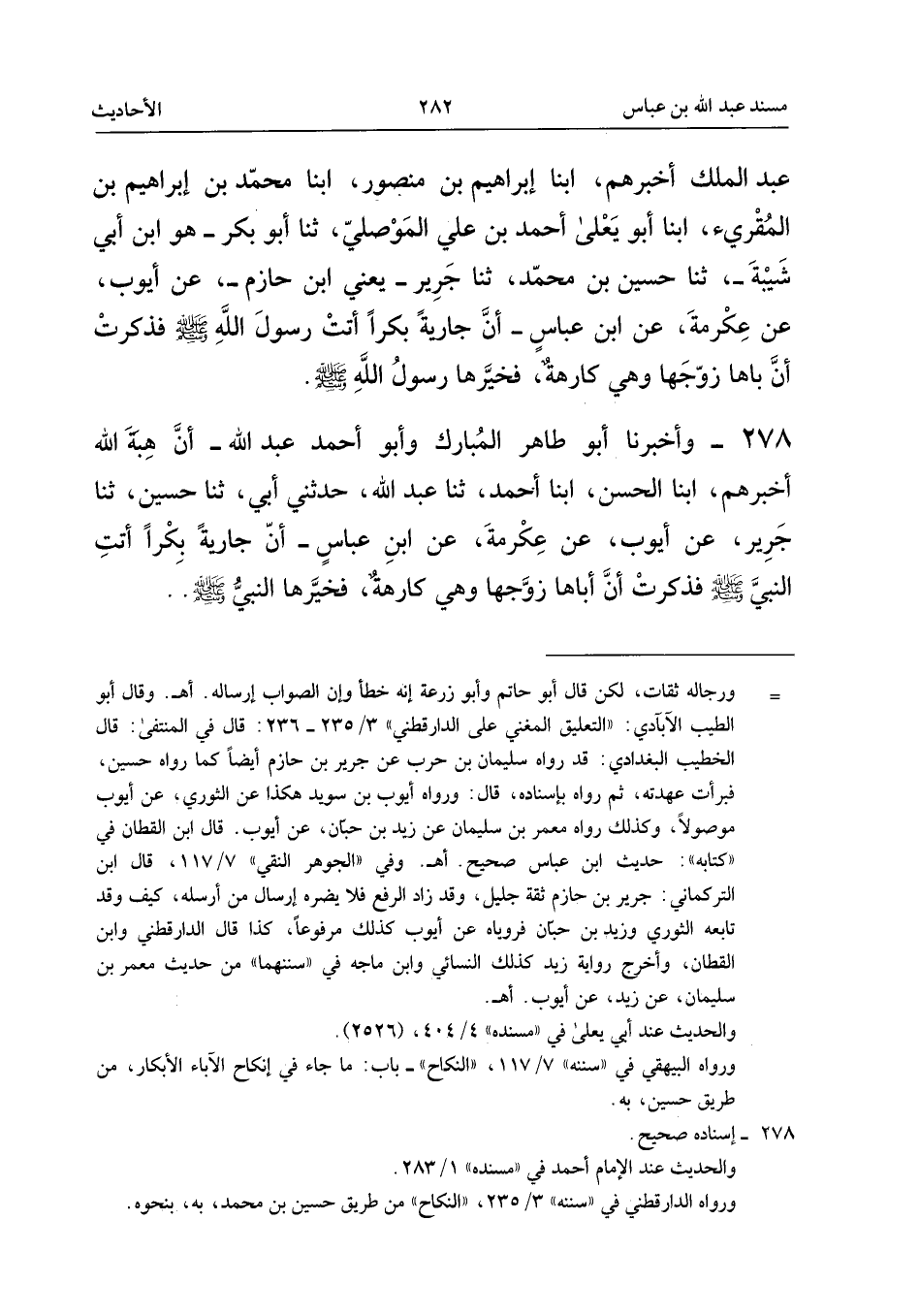 ٢٧٨ - وَأَخْبَرَنَا أَبُو طَاهِرٍ الْمُبَارَكُ وَأَبُو أَحْمَدَ عَبْدُ اللهِ، أَنَّ هِبَةَ اللهِ أَخْبَرَهُمْ، أَبْنَا الْحَسَنُ، أَبْنَا أَحْمَدُ، ثَنَا عَبْدُ اللهِ، حَدَّثَنِي أَبِي، ثَنَا حُسَيْنٌ، ثَنَا جَرِيرٌ، عَنْ أَيُّوبَ، عَنْ عِكْرِمَةَ، عَنِ ابْنِ عَبَّاسٍ، «أَنَّ جَارِيَةً بِكْرًا أَتَتِ النَّبِيَّ - صَلَّى اللهُ عَلَيْهِ وَسَلَّمَ - فَذَكَرَتْ أَنَّ أَبَاهَا زَوَّجَهَا وَهِيَ كَارِهَةٌ، فَخَيَّرَهَا النَّبِيُّ - صَلَّى اللهُ عَلَيْهِ وَسَلَّمَ» -.
