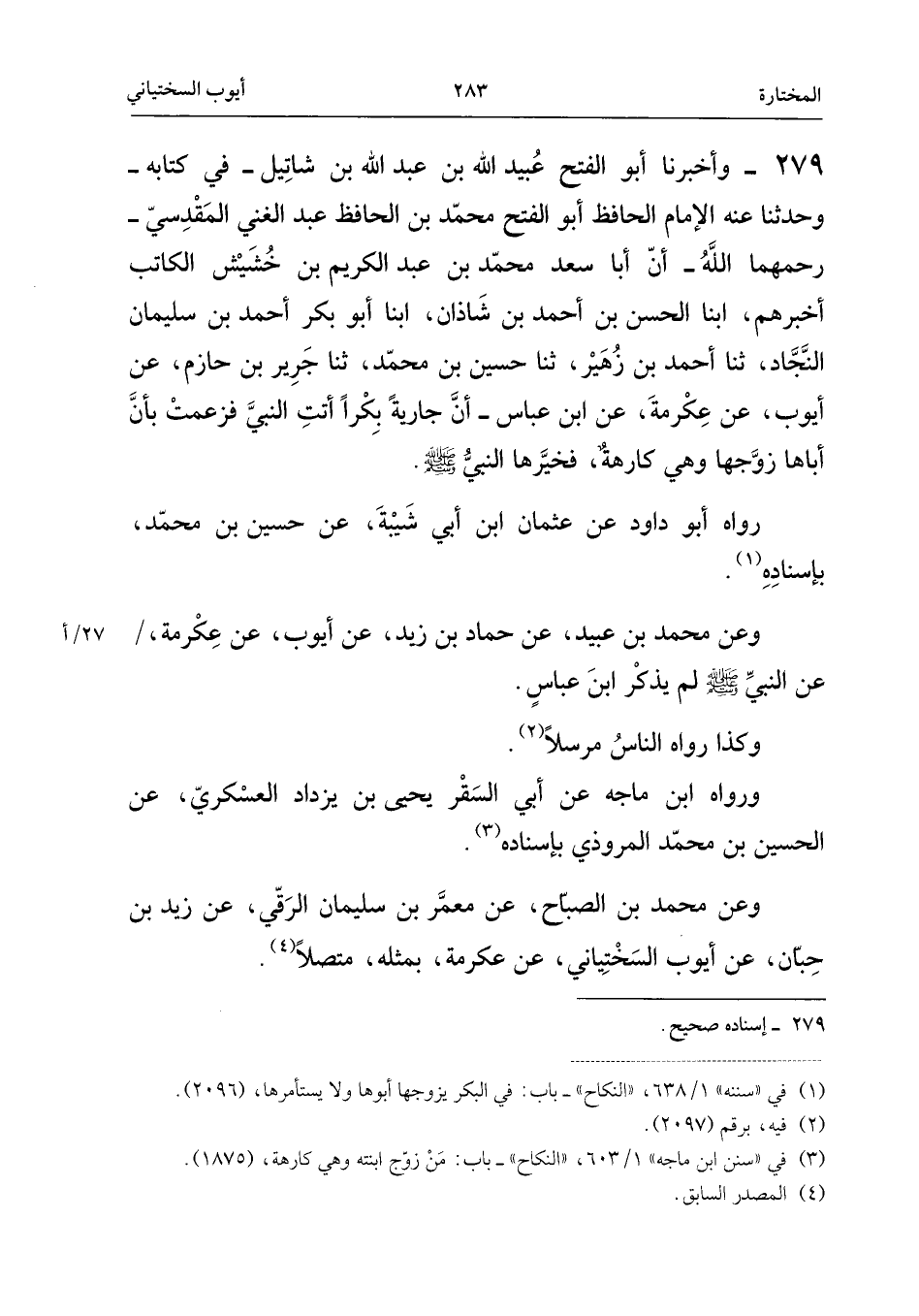 ٢٧٩ - وَأَخْبَرَنَا أَبُو الْفَتْحِ عُبَيْدُ اللهِ بْنُ عَبْدِ اللهِ بْنِ شَاتِيلَ - فِي كِتَابِهِ - وَحَدَّثَنَا عَنْهُ الْإِمَامُ الْحَافِظُ أَبُو الْفَتْحِ مُحَمَّدُ بْنُ الْحَافِظِ عَبْدِ الْغَنِيِّ الْمَقْدِسِيِّ - رَحِمَهُمَا اللهُ - أَنَّ أَبَا سَعْدٍ مُحَمَّدَ بْنَ عَبْدِ الْكَرِيمِ بْنِ خُشَيْشٍ الْكَاتِبَ أَخْبَرَهُمْ، أَبْنَا الْحَسَنُ بْنُ أَحْمَدَ بْنِ شَاذَانَ، أَبْنَا أَبُو بَكْرٍ أَحْمَدُ بْنُ سُلَيْمَانَ النَّجَّادُ، ثَنَا أَحْمَدُ بْنُ زُهَيْرٍ، ثَنَا حُسَيْنُ بْنُ مُحَمَّدٍ، ثَنَا جَرِيرُ بْنُ حَازِمٍ، عَنْ أَيُّوبَ، عَنْ عِكْرِمَةَ، عَنِ ابْنِ عَبَّاسٍ، «أَنَّ جَارِيَةً بِكْرًا أَتَتِ النَّبِيَّ، فَزَعَمَتْ بِأَنَّ أَبَاهَا زَوَّجَهَا وَهِيَ كَارِهَةٌ، فَخَيَّرَهَا النَّبِيُّ - صَلَّى اللهُ عَلَيْهِ وَسَلَّمَ» -.