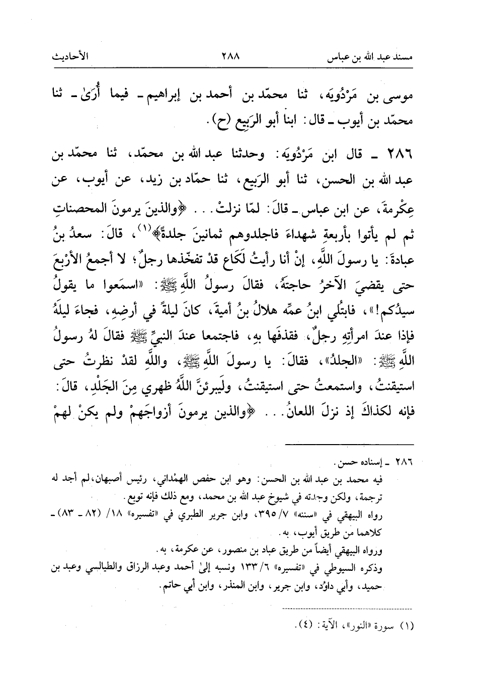 ٢٨٦ - قَالَ ابْنُ مَرْدُوَيْهِ: وَحَدَّثَنَا عَبْدُ اللهِ بْنُ مُحَمَّدٍ، ثَنَا مُحَمَّدُ بْنُ عَبْدِ اللهِ بْنِ الْحَسَنِ، ثَنَا أَبُو الرَّبِيعِ، ثَنَا حَمَّادُ بْنُ زَيْدٍ، عَنْ أَيُّوبَ، عَنْ عِكْرِمَةَ، عَنِ ابْنِ عَبَّاسٍ قَالَ: «لَمَّا نَزَلَتْ: {وَالَّذِينَ يَرْمُونَ الْمُحْصَنَاتِ ثُمَّ لَمْ يَأْتُوا بِأَرْبَعَةِ شُهَدَاءَ فَاجْلِدُوهُمْ ثَمَانِينَ جَلْدَةً}، قَالَ: سَعْدُ بْنُ عُبَادَةَ: يَا رَسُولَ اللهِ، إِنْ أَنَا رَأَيْتُ لَكَاعِ قَدْ تَفَخَّذَهَا رَجُلٌ؟ لَا أَجْمَعُ الْأَرْبَعَ حَتَّى يَقْضِيَ الْآخَرُ حَاجَتَهُ، فَقَالَ رَسُولُ اللهِ - صَلَّى اللهُ عَلَيْهِ وَسَلَّمَ -: اسْمَعُوا مَا يَقُولُ سَيِّدُكُمْ! فَابْتُلِيَ ابْنُ عَمِّهِ هِلَالُ بْنُ أُمَيَّةَ، كَانَ لَيْلَةً فِي أَرْضِهِ، فَجَاءَ لَيْلَهُ فَإِذَا عِنْدَ امْرَأَتِهِ رَجُلٌ، فَقَذَفَهَا بِهِ، فَاجْتَمَعَا عِنْدَ النَّبِيِّ - صَلَّى اللهُ عَلَيْهِ وَسَلَّمَ - فَقَالَ لَهُ رَسُولُ اللهِ - صَلَّى اللهُ عَلَيْهِ وَسَلَّمَ -: الْجَلْدُ، فَقَالَ: يَا رَسُولَ اللهِ - صَلَّى اللهُ عَلَيْهِ وَسَلَّمَ -، وَاللهِ لَقَدْ نَظَرْتُ حَتَّى اسْتَيْقَنْتُ، وَاسْتَمَعْتُ حَتَّى اسْتَيْقَنْتُ، وَلَيُبَرِّئَنَّ اللهُ ظَهْرِي مِنَ الْجَلْدِ، قَالَ: فَإِنَّهُ لَكَذَاكَ إِذْ نَزَلَ اللِّعَانُ:
