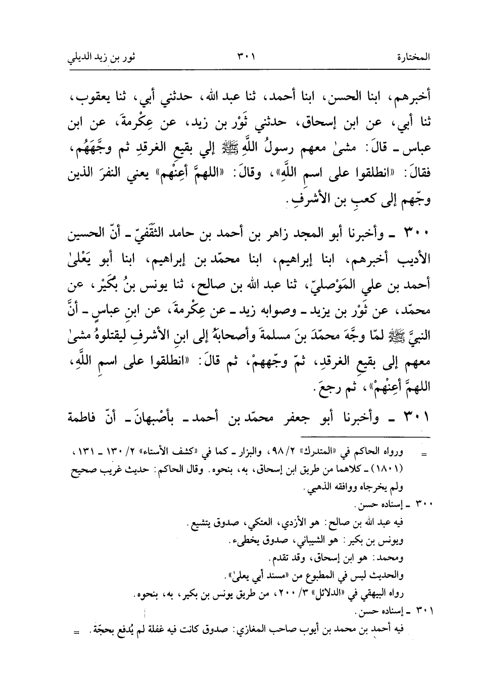 ٣٠٠ - وَأَخْبَرَنَا أَبُو الْمَجْدِ زَاهِرُ بْنُ أَحْمَدَ بْنِ حَامِدٍ الثَّقَفِيُّ، أَنَّ الْحُسَيْنَ الْأَدِيبَ أَخْبَرَهُمْ، أَبْنَا إِبْرَاهِيمُ، أَبْنَا مُحَمَّدُ بْنُ إِبْرَاهِيمَ، أَبْنَا أَبُو يَعْلَى أَحْمَدُ بْنُ عَلِيٍّ الْمَوْصِلِيُّ، ثَنَا عَبْدُ اللهِ بْنُ صَالِحٍ (¬١)، ثَنَا يُونُسُ بْنُ بُكَيْرٍ، عَنْ مُحَمَّدٍ، عَنْ ثَوْرِ بْنِ يَزِيدَ - وَصَوَابُهُ زَيْدٌ - عَنْ عِكْرِمَةَ، عَنِ ابْنِ عَبَّاسٍ، «أَنَّ النَّبِيَّ - صَلَّى اللهُ عَلَيْهِ وَسَلَّمَ - لَمَّا وَجَّهَ مُحَمَّدَ بْنَ مَسْلَمَةَ وَأَصْحَابَهُ إِلَى ابْنِ الْأَشْرَفِ لِيَقْتُلُوهُ مَشَى مَعَهُمْ إِلَى بَقِيعِ الْغَرْقَدِ، ثُمَّ وَجَّهَهُمْ، ثُمَّ قَالَ: انْطَلِقُوا عَلَى اسْمِ اللهِ، اللَّهُمَّ أَعِنْهُمْ، ثُمَّ رَجَعَ».