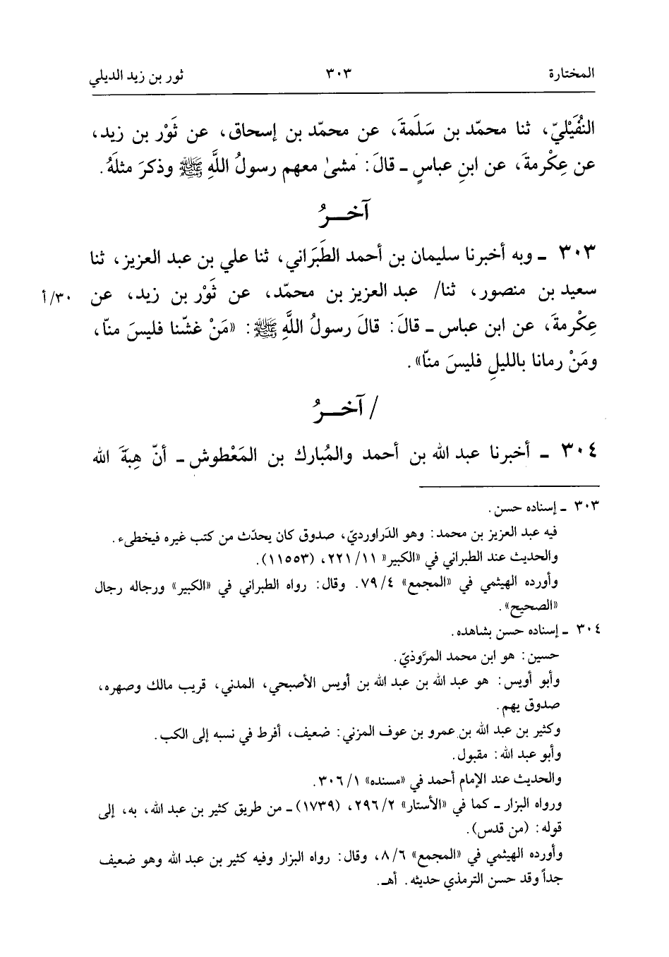 ٣٠٣ - وَبِهِ أَخْبَرَنَا سُلَيْمَانُ بْنُ أَحْمَدَ الطَّبَرَانِيُّ، ثَنَا عَلِيُّ بْنُ عَبْدِ الْعَزِيزِ، ثَنَا سَعِيدُ بْنُ مَنْصُورٍ، ثَنَا عَبْدُ الْعَزِيزِ بْنُ مُحَمَّدٍ، عَنْ ثَوْرِ بْنِ زَيْدٍ، عَنْ عِكْرِمَةَ، عَنِ ابْنِ عَبَّاسٍ قَالَ: قَالَ رَسُولُ اللهِ - صَلَّى اللهُ عَلَيْهِ وَسَلَّمَ -: «مَنْ غَشَّنَا فَلَيْسَ مِنَّا، وَمَنْ رَمَانَا بِاللَّيْلِ فَلَيْسَ مِنَّا».