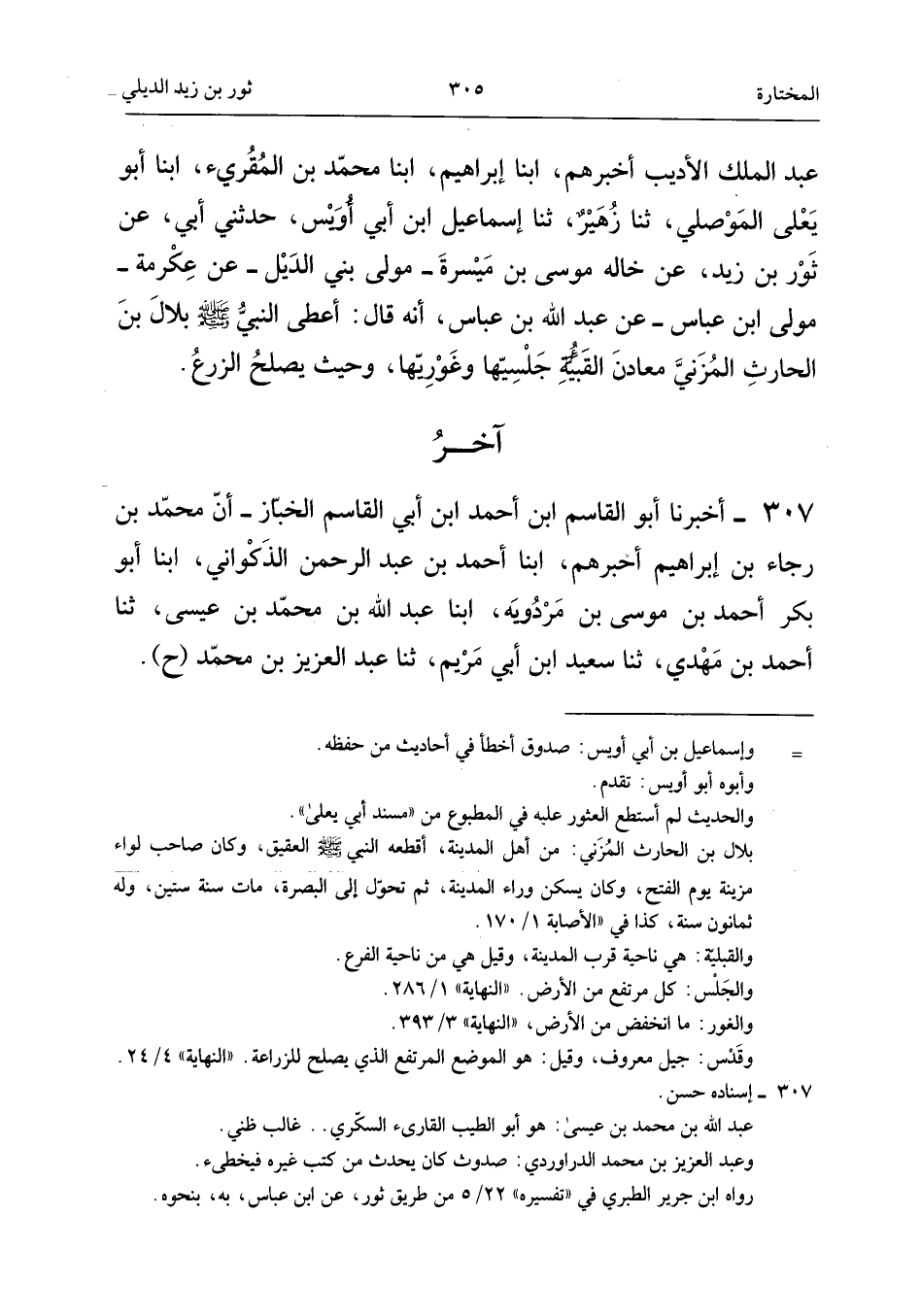 ٣٠٧ - أَخْبَرَنَا أَبُو الْقَاسِمِ بْنُ أَحْمَدَ بْنِ أَبِي الْقَاسِمِ الْخَبَّازُ، أَنَّ مُحَمَّدَ بْنَ رَجَاءِ بْنِ إِبْرَاهِيمَ أَخْبَرَهُمْ، أَبْنَا أَحْمَدُ بْنُ عَبْدِ الرَّحْمَنِ الذَّكْوَانِيُّ، أَبْنَا أَبُو بَكْرٍ أَحْمَدُ بْنُ مُوسَى بْنِ مَرْدُوَيْهِ، أَبْنَا عَبْدُ اللهِ بْنُ مُحَمَّدِ بْنِ عِيسَى، ثَنَا أَحْمَدُ بْنُ مَهْدِيٍّ، ثَنَا سَعِيدُ بْنُ أَبِي مَرْيَمَ، ثَنَا عَبْدُ الْعَزِيزِ بْنُ مُحَمَّدٍ (حَ).