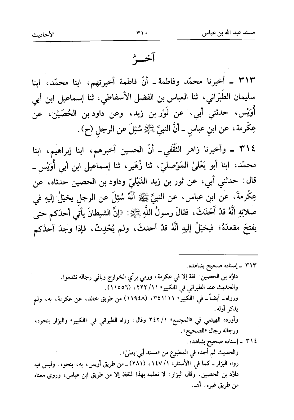 ٣١٤ - وَأَخْبَرَنَا زَاهِرٌ الثَّقَفِيُّ، أَنَّ الْحُسَيْنَ أَخْبَرَهُمْ، أَبْنَا إِبْرَاهِيمُ، أَبْنَا مُحَمَّدٌ، أَبْنَا أَبُو يَعْلَى الْمَوْصِلِيُّ، ثَنَا زُهَيْرٌ، ثَنَا إِسْمَاعِيلُ بْنُ أَبِي أُوَيْسٍ، قَالَ: حَدَّثَنِي أَبِي عَنْ ثَوْرِ بْنِ زَيْدٍ الدِّيلِيِّ وَدَاوُدَ بْنِ الْحُصَيْنِ، حَدَّثَاهُ، عَنْ عِكْرِمَةَ، عَنِ ابْنِ عَبَّاسٍ عَنِ النَّبِيِّ - صَلَّى اللهُ عَلَيْهِ وَسَلَّمَ - «أَنَّهُ سُئِلَ عَنِ الرَّجُلِ يُخَيَّلُ إِلَيْهِ فِي صَلَاتِهِ أَنَّهُ قَدْ أَحْدَثَ، فَقَالَ رَسُولُ اللهِ - صَلَّى اللهُ عَلَيْهِ وَسَلَّمَ -: إِنَّ الشَّيْطَانَ يَأْتِي أَحَدَكُمْ حَتَّى يَفْتَحَ مَقْعَدَهُ فَيُخَيَّلُ إِلَيْهِ أَنَّهُ قَدْ أَحْدَثَ، وَلَمْ يُحْدِثْ، فَإِذَا وَجَدَ أَحَدُكُمْ