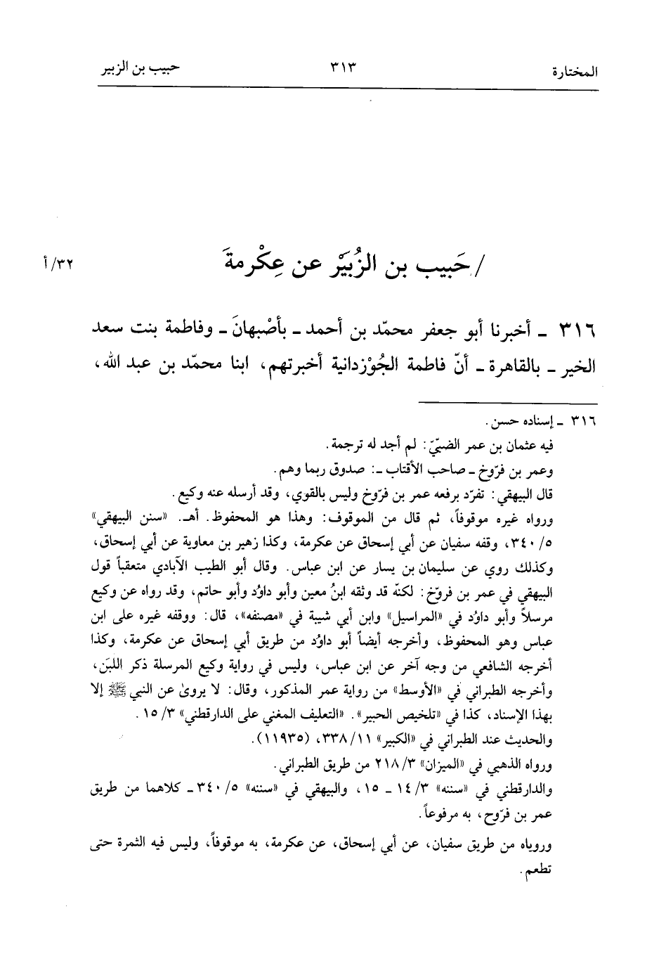 ، أَبْنَا سُلَيْمَانُ بْنُ أَحْمَدَ الطَّبَرَانِيُّ، ثَنَا عُثْمَانُ بْنُ عُمَرَ الضَّبِّيُّ، ثَنَا حَفْصُ بْنُ عُمَرَ الْحَوْضِيُّ، ثَنَا عُمَرُ بْنُ فَرُّوخَ - صَاحِبُ الْأَقْتَابِ -، ثَنَا حَبِيبُ بْنُ الزُّبَيْرِ، عَنْ عِكْرِمَةَ، عَنِ ابْنِ عَبَّاسٍ - رَضِيَ اللهُ عَنْهُمَا - قَالَ: «نَهَى رَسُولُ اللهِ - صَلَّى اللهُ عَلَيْهِ وَسَلَّمَ - أَنْ تُبَاعَ ثَمَرَةٌ حَتَّى تُطْعَمَ، وَلَا صُوفٌ عَلَى ظَهْرٍ، وَلَا لَبَنٌ فِي ضَرْعٍ».