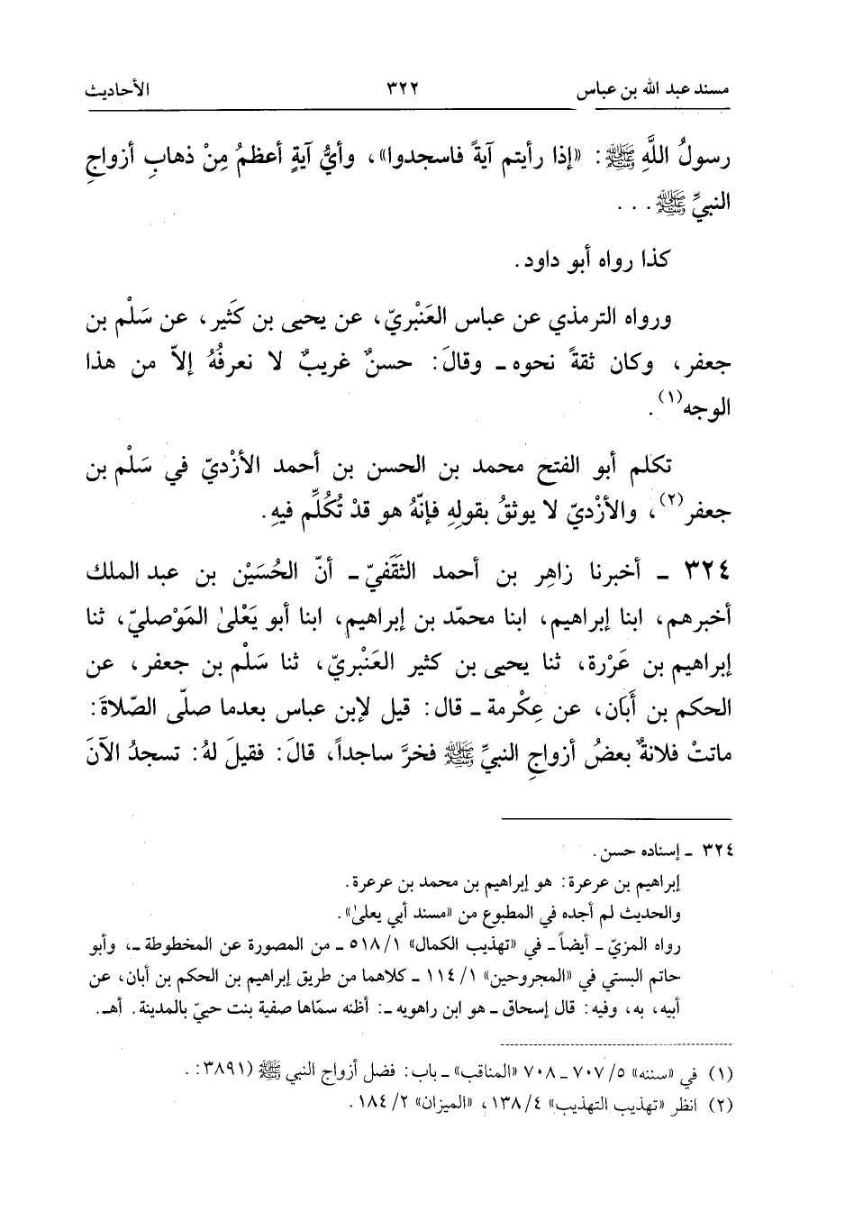 ٣٢٤ - أَخْبَرَنَا زَاهِرُ بْنُ أَحْمَدَ الثَّقَفِيُّ، أَنَّ الْحُسَيْنَ بْنَ عَبْدِ الْمَلِكِ أَخْبَرَهُمْ، أَبْنَا إِبْرَاهِيمُ، أَبْنَا مُحَمَّدُ بْنُ إِبْرَاهِيمَ، أَبْنَا أَبُو يَعْلَى الْمَوْصِلِيُّ، ثَنَا إِبْرَاهِيمُ بْنُ عَرْعَرَةَ، ثَنَا يَحْيَى بْنُ كَثِيرٍ الْعَنْبَرِيُّ، ثَنَا سَلْمُ بْنُ جَعْفَرٍ، عَنِ الْحَكَمِ بْنِ أَبَانَ، عَنْ عِكْرِمَةَ قَالَ: «قِيلَ لِابْنِ عَبَّاسٍ بَعْدَمَا صَلَّى الصَّلَاةَ: مَاتَتْ فُلَانَةُ بَعْضُ أَزْوَاجِ النَّبِيِّ - صَلَّى اللهُ عَلَيْهِ وَسَلَّمَ - فَخَرَّ سَاجِدًا، قَالَ: فَقِيلَ لَهُ: تَسْجُدُ الْآنَ