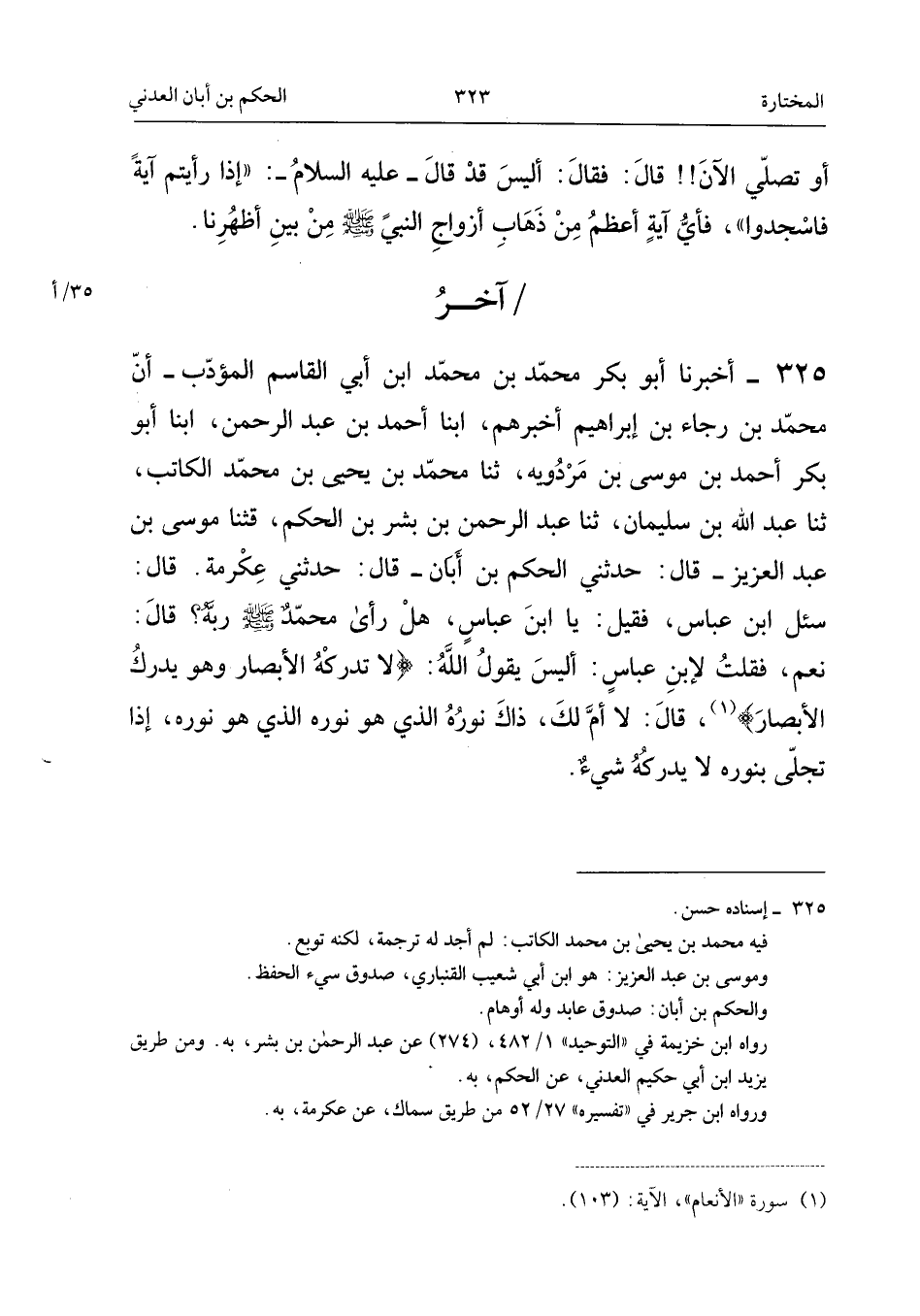 ٣٢٥ - أَخْبَرَنَا أَبُو بَكْرٍ مُحَمَّدُ بْنُ مُحَمَّدِ بْنِ أَبِي الْقَاسِمِ الْمُؤَدِّبُ، أَنَّ مُحَمَّدَ بْنَ رَجَاءِ بْنِ إِبْرَاهِيمَ أَخْبَرَهُمْ، أَبْنَا أَحْمَدُ بْنُ عَبْدِ الرَّحْمَنِ، أَبْنَا أَبُو بَكْرٍ أَحْمَدُ بْنُ مُوسَى بْنِ مَرْدُوَيْهِ، ثَنَا مُحَمَّدُ بْنُ يَحْيَى بْنِ مُحَمَّدٍ الْكَاتِبُ، ثَنَا عَبْدُ اللهِ بْنُ سُلَيْمَانَ، ثَنَا عَبْدُ الرَّحْمَنِ بْنُ بِشْرِ بْنِ الْحَكَمِ، قَثَنَا مُوسَى بْنُ عَبْدِ الْعَزِيزِ، قَالَ: حَدَّثَنِي الْحَكَمُ بْنُ أَبَانَ، قَالَ: حَدَّثَنِي عِكْرِمَةُ، قَالَ: «سُئِلَ ابْنُ عَبَّاسٍ، فَقِيلَ: يَا ابْنَ عَبَّاسٍ، هَلْ رَأَى مُحَمَّدٌ - صَلَّى اللهُ عَلَيْهِ وَسَلَّمَ - رَبَّهُ؟ قَالَ: نَعَمْ، فَقُلْتُ لِابْنِ عَبَّاسٍ: أَلَيْسَ يَقُولُ اللهُ: {لا تُدْرِكُهُ الأَبْصَارُ وَهُوَ يُدْرِكُ الأَبْصَارَ}، قَالَ: لَا أُمَّ لَكَ، ذَاكَ نُورُهُ الَّذِي هُوَ نُورُهُ الَّذِي هُوَ نُورُهُ، إِذَا تَجَلَّى بِنُورِهِ لَا يُدْرِكُهُ شَيْءٌ».