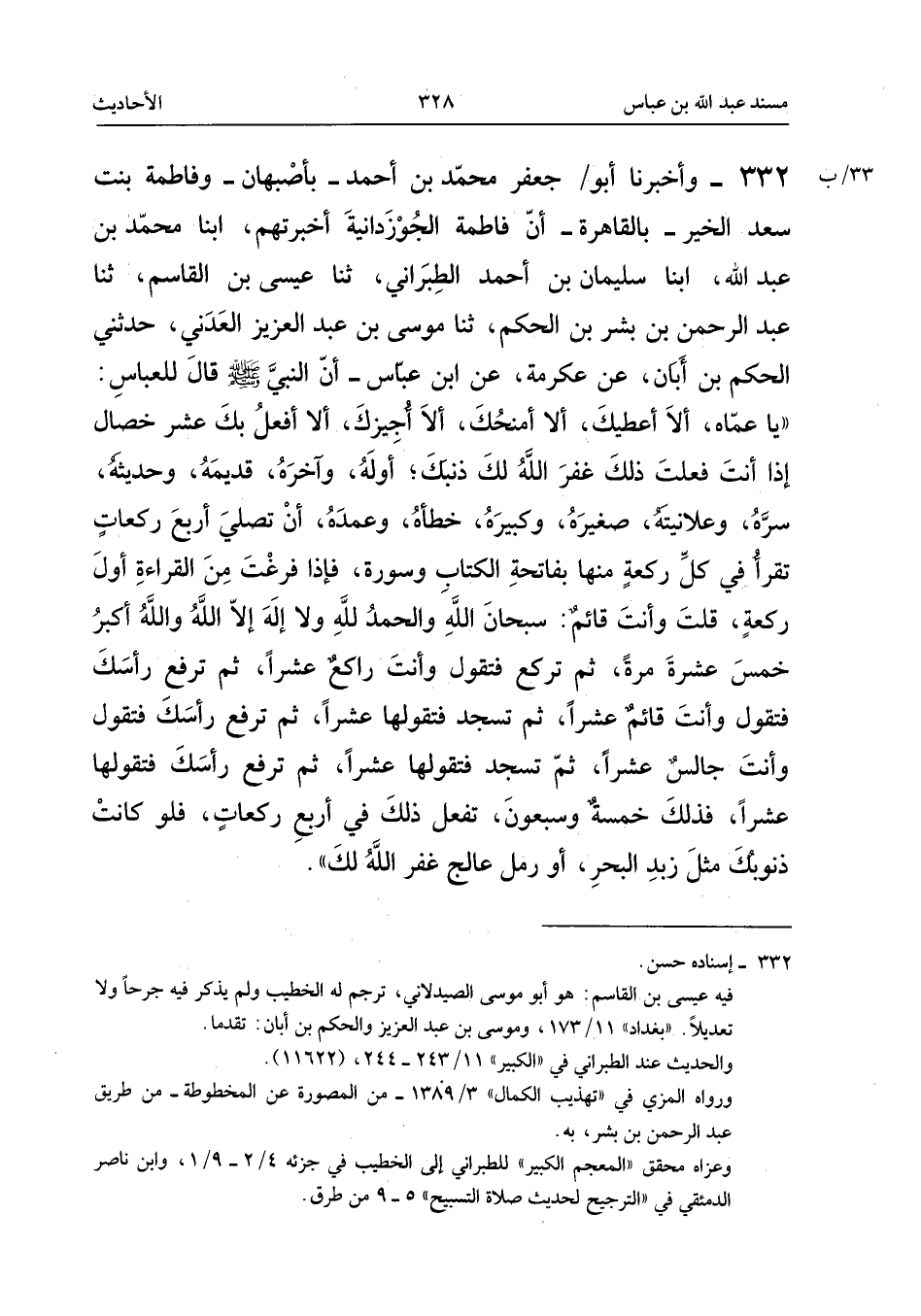 ٣٣٢ - وَأَخْبَرَنَا أَبُو جَعْفَرٍ مُحَمَّدُ بْنُ أَحْمَدَ - بِأَصْبَهَانَ - وَفَاطِمَةُ بِنْتُ سَعْدِ الْخَيْرِ - بِالْقَاهِرَةِ - أَنَّ فَاطِمَةَ الْجُوزْدَانِيَّةَ أَخْبَرَتْهُمْ، أَبْنَا مُحَمَّدُ بْنُ عَبْدِ اللهِ، أَبْنَا سُلَيْمَانُ بْنُ أَحْمَدَ الطَّبَرَانِيُّ، ثَنَا عِيسَى بْنُ الْقَاسِمِ (¬١)، ثَنَا عَبْدُ الرَّحْمَنِ بْنُ بِشْرِ بْنِ الْحَكَمِ، ثَنَا مُوسَى بْنُ عَبْدِ الْعَزِيزِ الْعَدَنِيُّ، حَدَّثَنِي الْحَكَمُ بْنُ أَبَانَ، عَنْ عِكْرِمَةَ، عَنِ ابْنِ عَبَّاسٍ، «أَنَّ النَّبِيَّ - صَلَّى اللهُ عَلَيْهِ وَسَلَّمَ - قَالَ لِلْعَبَّاسِ: يَا عَمَّاهُ، أَلَا أُعْطِيكَ، أَلَا أَمْنَحُكَ، أَلَا أُجِيزُكَ، أَلَا أَفْعَلُ بِكَ عَشْرَ خِصَالٍ إِذَا أَنْتَ فَعَلْتَ ذَلِكَ غَفَرَ اللهُ لَكَ ذَنْبَكَ؟ أَوَّلَهُ وَآخِرَهُ، قَدِيمَهُ وَحَدِيثَهُ، سِرَّهُ وَعَلَانِيَتَهُ، صَغِيرَهُ وَكَبِيرَهُ، خَطَأَهُ وَعَمْدَهُ؛ أَنْ تُصَلِّيَ أَرْبَعَ رَكَعَاتٍ، تَقْرَأُ فِي كُلِّ رَكْعَةِ مِنْهَا بِفَاتِحَةِ الْكِتَابِ وَسُورَةٍ، فَإِذَا فَرَغْتَ مِنَ الْقِرَاءَةِ أَوَّلَ رَكْعَةٍ، قُلْتَ وَأَنْتَ قَائِمٌ: سُبْحَانَ اللهِ وَالْحَمْدُ لِلهِ، وَلَا إِلَهَ إِلَّا اللهُ وَاللهُ أَكْبَرُ، خَمْسَ عَشْرَةَ مَرَّةً، ثُمَّ تَرْكَعَ فَتَقُولَ وَأَنْتَ رَاكِعٌ عَشْرًا، ثُمَّ تَرْفَعَ رَأْسَكَ فَتَقُولَ وَأَنْتَ قَائِمٌ عَشْرًا، ثُمَّ تَسْجُدَ فَتَقُولَهَا عَشْرًا، ثُمَّ تَرْفَعَ رَأْسَكَ فَتَقُولَ وَأَنْتَ جَالِسٌ عَشْرًا، ثُمَّ تَسْجُدَ فَتَقُولَهَا عَشْرًا، ثُمَّ تَرْفَعَ رَأْسَكَ فَتَقُولَهَا عَشْرًا، فَذَلِكَ خَمْسَةٌ وَسَبْعُونَ، تَفْعَلُ ذَلِكَ فِي أَرْبَعِ رَكَعَاتٍ، فَلَوْ كَانَتْ ذُنُوبُكَ مِثْلَ زَبَدِ الْبَحْرِ أَوْ رَمْلِ عَالِجٍ غَفَرَ اللهُ لَكَ».