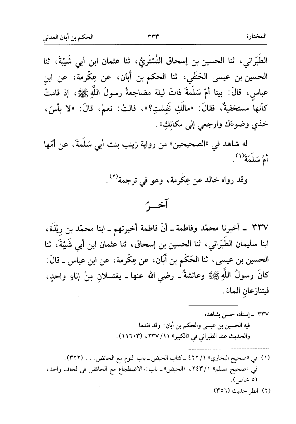 ٣٣٧ - أَخْبَرَنَا مُحَمَّدٌ وَفَاطِمَةُ، أَنَّ فَاطِمَةَ أَخْبَرَتْهُمْ، أَبْنَا مُحَمَّدُ بْنُ رِيذَةَ، أَبْنَا سُلَيْمَانُ الطَّبَرَانِيُّ، ثَنَا الْحُسَيْنُ بْنُ إِسْحَاقَ، ثَنَا عُثْمَانُ بْنُ أَبِي شَيْبَةَ، ثَنَا الْحُسَيْنُ بْنُ عِيسَى، ثَنَا الْحَكَمُ بْنُ أَبَانَ، عَنْ عِكْرِمَةَ، عَنِ ابْنِ عَبَّاسٍ قَالَ: «كَانَ رَسُولُ اللهِ - صَلَّى اللهُ عَلَيْهِ وَسَلَّمَ - وَعَائِشَةُ - رَضِيَ اللهُ عَنْهَا - يَغْتَسِلَانِ مِنْ إِنَاءٍ وَاحِدٍ، فَيَتَنَازَعَانِ الْمَاءَ».