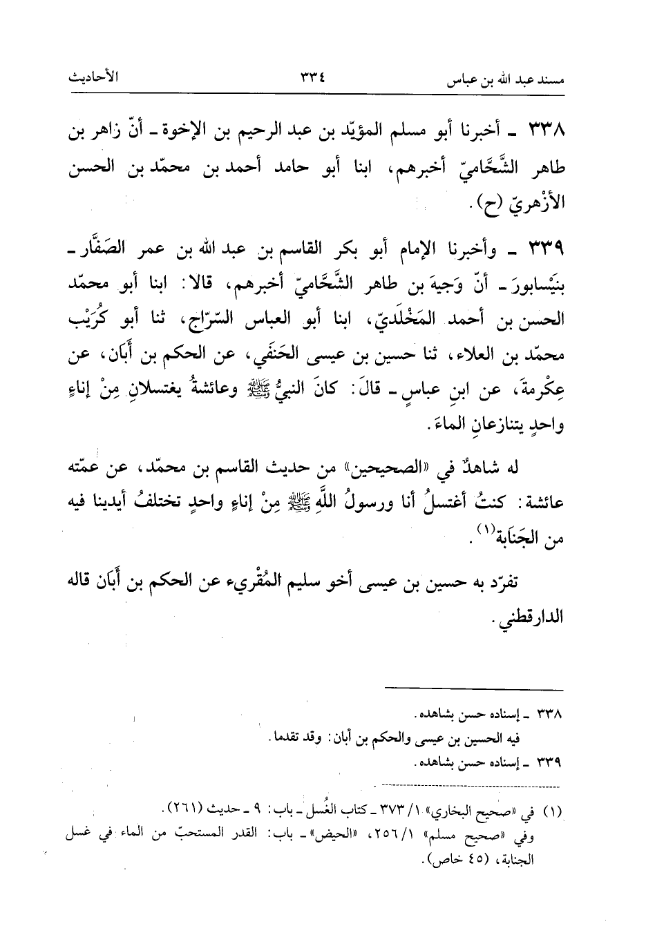 ٣٣٩ - وَأَخْبَرَنَا الْإِمَامُ أَبُو بَكْرٍ الْقَاسِمُ بْنُ عَبْدِ اللهِ بْنِ عُمَرَ الصَّفَّارُ - بِنَيْسَابُورَ - أَنَّ وَجِيهَ بْنَ طَاهِرٍ الشَّحَّامِيَّ أَخْبَرَهُمْ، قَالَا: أَبْنَا أَبُو مُحَمَّدٍ الْحَسَنُ بْنُ أَحْمَدَ الْمَخْلَدِيُّ، أَبْنَا أَبُو الْعَبَّاسِ السَّرَّاجُ، ثَنَا أَبُو كُرَيْبٍ مُحَمَّدُ بْنُ الْعَلَاءِ، ثَنَا حُسَيْنُ بْنُ عِيسَى الْحَنَفِيُّ، عَنِ الْحَكَمِ بْنِ أَبَانَ، عَنْ عِكْرِمَةَ، عَنِ ابْنِ عَبَّاسٍ قَالَ: «كَانَ النَّبِيُّ - صَلَّى اللهُ عَلَيْهِ وَسَلَّمَ - وَعَائِشَةُ يَغْتَسِلَانِ مِنْ إِنَاءٍ وَاحِدٍ يَتَنَازَعَانِ الْمَاءَ».