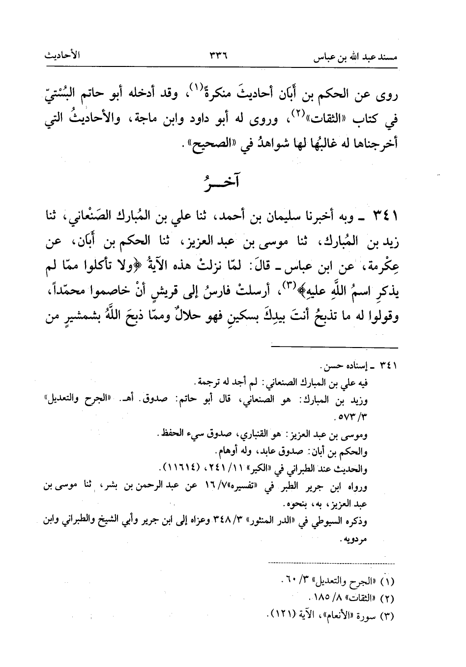 ٣٤١ - وَبِهِ أَخْبَرَنَا سُلَيْمَانُ بْنُ أَحْمَدَ، ثَنَا عَلِيُّ بْنُ الْمُبَارَكِ الصَّنْعَانِيُّ، ثَنَا زَيْدُ بْنُ الْمُبَارَكِ، ثَنَا مُوسَى بْنُ عَبْدِ الْعَزِيزِ، ثَنَا الْحَكَمُ بْنُ أَبَانَ، عَنْ عِكْرِمَةَ، عَنِ ابْنِ عَبَّاسٍ قَالَ: «لَمَّا نَزَلَتْ هَذِهِ الْآيَةُ: {وَلا تَأْكُلُوا مِمَّا لَمْ يُذْكَرِ اسْمُ اللهِ عَلَيْهِ}، أَرْسَلَتْ فَارِسُ إِلَى قُرَيْشٍ أَنْ خَاصِمُوا مُحَمَّدًا، وَقُولُوا لَهُ: مَا تَذْبَحُ أَنْتَ بِيَدِكَ بِسِكِّينٍ فَهُوَ حَلَالٌ، وَمَا ذَبَحَ اللهُ بِشَمْشِيرٍ مِنْ