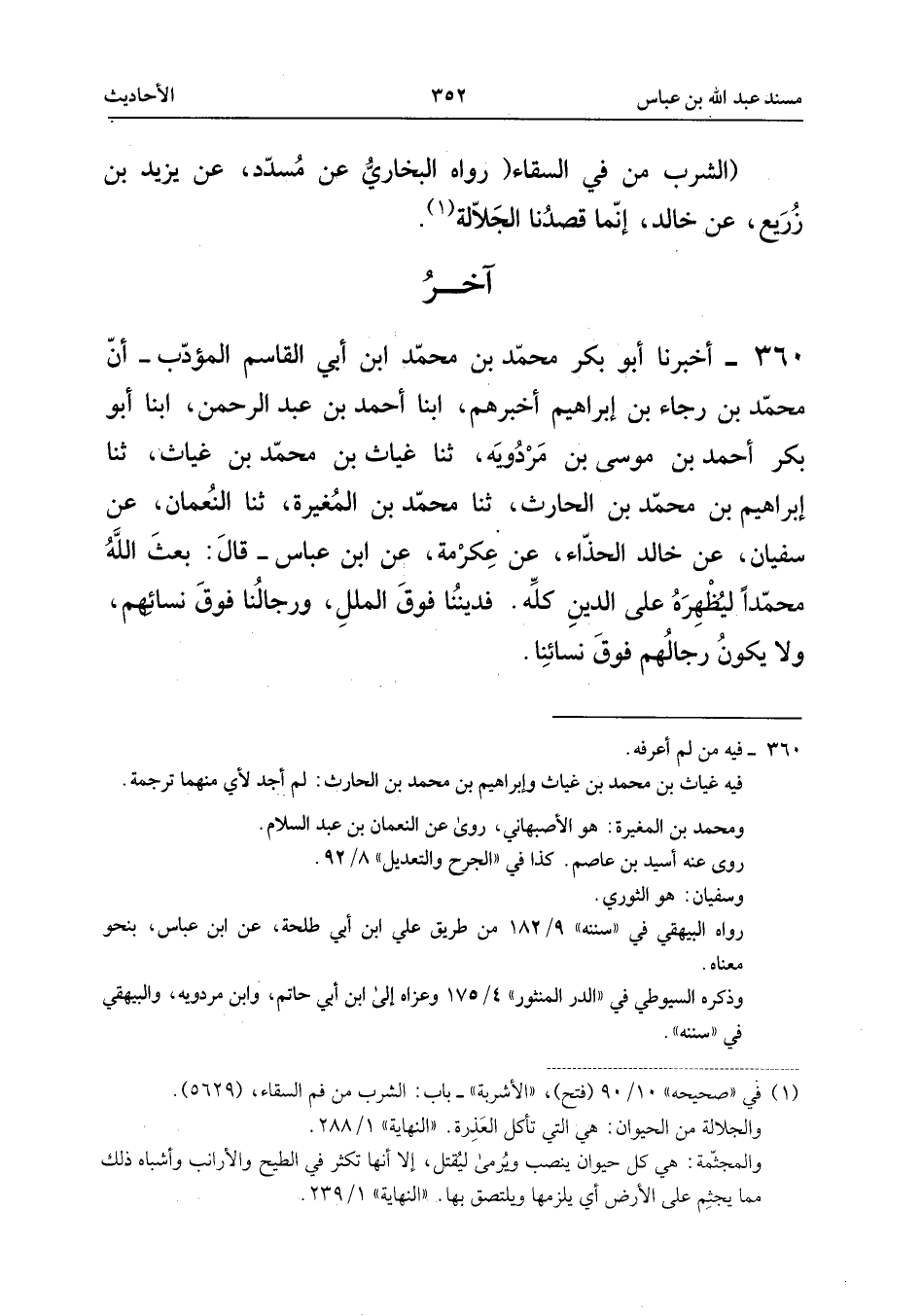٣٦٠ - أَخْبَرَنَا أَبُو بَكْرٍ مُحَمَّدُ بْنُ مُحَمَّدِ بْنِ أَبِي الْقَاسِمِ الْمُؤَدِّبُ - أَنَّ مُحَمَّدَ بْنَ رَجَاءِ بْنِ إِبْرَاهِيمَ أَخْبَرَهُمْ، أَبْنَا أَحْمَدُ بْنُ عَبْدِ الرَّحْمَنِ، أَبْنَا أَبُو بَكْرٍ أَحْمَدُ بْنُ مُوسَى بْنِ مَرْدُوَيْهِ، ثَنَا غِيَاثُ بْنُ مُحَمَّدِ بْنِ غِيَاثٍ، ثَنَا إِبْرَاهِيمُ بْنُ مُحَمَّدِ بْنِ الْحَارِثِ، ثَنَا مُحَمَّدُ بْنُ الْمُغِيرَةِ، ثَنَا النُّعْمَانُ، عَنْ سُفْيَانَ، عَنْ خَالِدٍ الْحَذَّاءِ، عَنْ عِكْرِمَةَ، عَنِ ابْنِ عَبَّاسٍ قَالَ: «بَعَثَ اللهُ مُحَمَّدًا لِيُظْهِرَهُ عَلَى الدِّينِ كُلِّهِ، فَدِينُنَا فَوْقَ الْمِلَلِ، وَرِجَالُنَا فَوْقَ نِسَائِهِمْ، وَلَا يَكُونُ رِجَالُهُمْ فَوْقَ نِسَائِنَا».