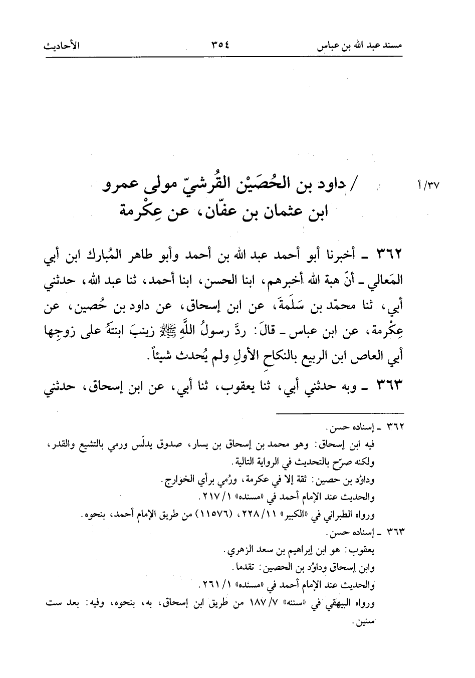 ٣٦٢ - أَخْبَرَنَا أَبُو أَحْمَدَ عَبْدُ اللهِ بْنُ أَحْمَدَ (¬١) وَأَبُو طَاهِرٍ الْمُبَارَكُ ابْنُ أَبِي الْمَعَالِي، أَنَّ هِبَةَ اللهِ أَخْبَرَهُمْ، أَبْنَا الْحَسَنُ، أَبْنَا أَحْمَدُ، ثَنَا عَبْدُ اللهِ، حَدَّثَنِي أَبِي، ثَنَا مُحَمَّدُ بْنُ سَلَمَةَ، عَنِ ابْنِ إِسْحَاقَ، عَنْ دَاوُدَ بْنِ حُصَيْنٍ، عَنْ عِكْرِمَةَ، عَنِ ابْنِ عَبَّاسٍ قَالَ: «رَدَّ رَسُولُ اللهِ - صَلَّى اللهُ عَلَيْهِ وَسَلَّمَ - زَيْنَبَ ابْنَتَهُ عَلَى زَوْجِهَا أَبِي الْعَاصِ بْنِ الرَّبِيعِ بِالنِّكَاحِ الْأَوَّلِ وَلَمْ يُحْدِثْ شَيْئًا».