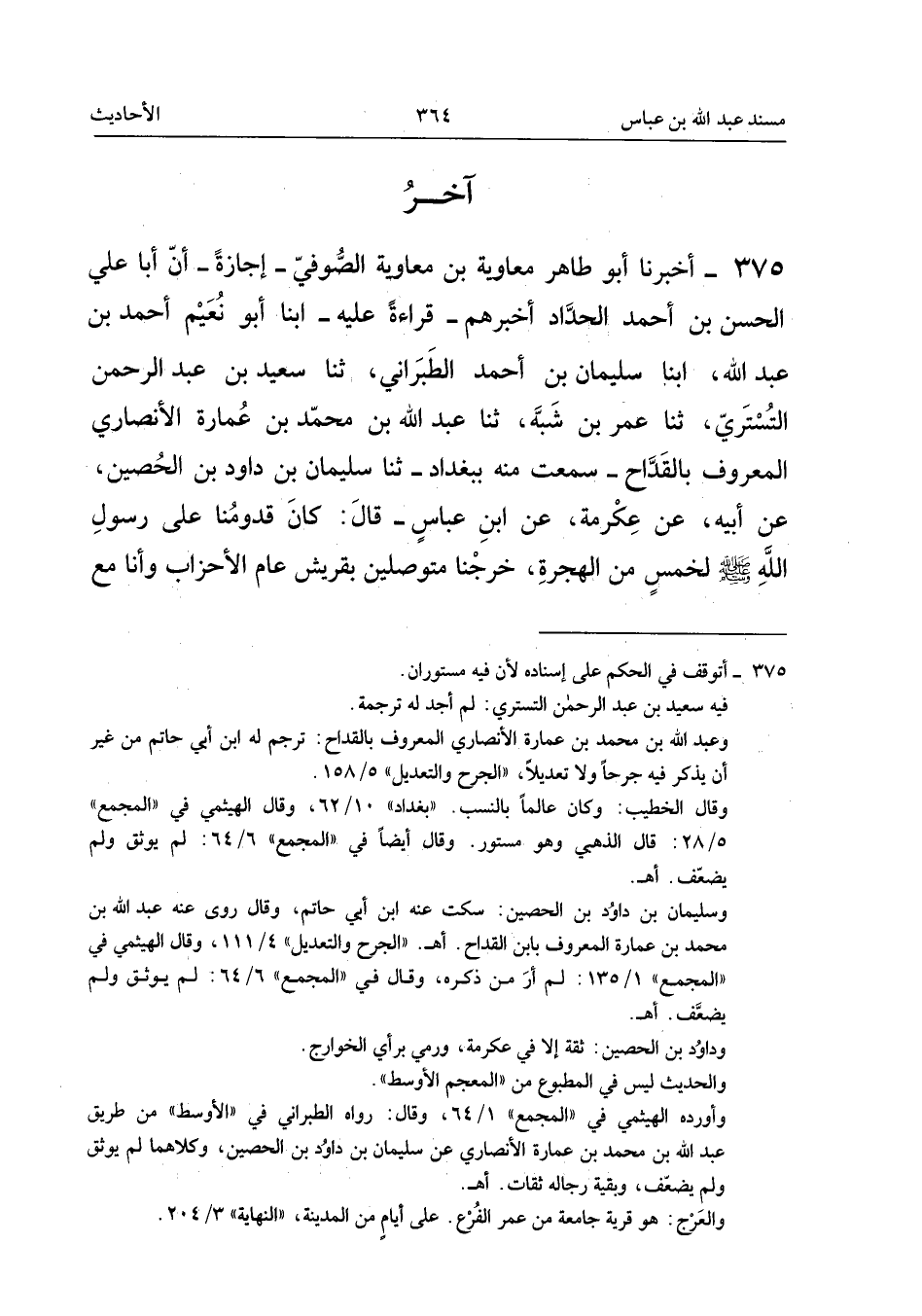 ٣٧٥ - أَخْبَرَنَا أَبُو طَاهِرٍ مُعَاوِيَةُ بْنُ مُعَاوِيَةَ الصُّوفِيُّ - إِجَازَةً - أَنَّ أَبَا عَلِيٍّ الْحَسَنَ بْنَ أَحْمَدَ الْحَدَّادَ أَخْبَرَهُمْ - قِرَاءَةً عَلَيْهِ - أَبْنَا أَبُو نُعَيْمٍ أَحْمَدُ بْنُ عَبْدِ اللهِ، أَبْنَا سُلَيْمَانُ بْنُ أَحْمَدَ الطَّبَرَانِيُّ، ثَنَا سَعِيدُ بْنُ عَبْدِ الرَّحْمَنِ التُّسْتَرِيُّ، ثَنَا عُمَرُ بْنُ شَبَّةَ، ثَنَا عَبْدُ اللهِ بْنُ مُحَمَّدِ بْنِ عُمَارَةَ الْأَنْصَارِيُّ الْمَعْرُوفُ بِالْقَدَّاحِ - سَمِعْتُ مِنْهُ بِبَغْدَادَ - ثَنَا سُلَيْمَانُ بْنُ دَاوُدَ بْنِ الْحُصَيْنِ، عَنْ أَبِيهِ، عَنْ عِكْرِمَةَ، عَنِ ابْنِ عَبَّاسٍ قَالَ: «كَانَ قُدُومُنَا عَلَى رَسُولِ اللهِ - صَلَّى اللهُ عَلَيْهِ وَسَلَّمَ - لِخَمْسٍ مِنَ الْهِجْرَةِ، خَرَجْنَا مُتَوَصِّلِينَ بِقُرَيْشٍ عَامَ الْأَحْزَابِ وَأَنَا مَعَ