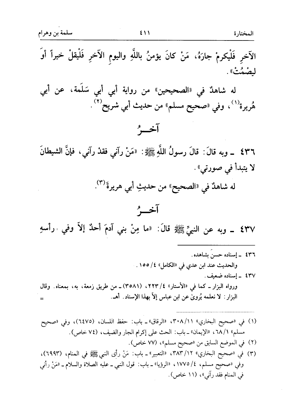 ٤٣٦ - وَبِهِ قَالَ: قَالَ رَسُولُ اللهِ - صَلَّى اللهُ عَلَيْهِ وَسَلَّمَ -: «مَنْ رَآنِي فَقَدْ رَآنِي؛ فَإِنَّ الشَّيْطَانَ لَا يَتَبَدَّأُ فِي صُورَتِي».