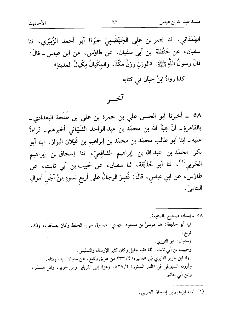 ٥٨ - أَخْبَرَنَا أَبُو الْحَسَنِ عَلِيُّ بْنُ حَمْزَةَ بْنِ عَلِيِّ بْنِ طَلْحَةَ الْبَغْدَادِيُّ - بِالْقَاهِرَةِ - أَنَّ هِبَةَ اللهِ بْنَ مُحَمَّدِ بْنِ عَبْدِ الْوَاحِدِ الشَّيْبَانِيَّ أَخْبَرَهُمْ - قِرَاءَةً عَلَيْهِ - أَبْنَا أَبُو طَالِبٍ مُحَمَّدُ بْنُ مُحَمَّدِ بْنِ إِبْرَاهِيمَ بْنِ غَيْلَانَ الْبَزَّازُ، أَبْنَا أَبُو بَكْرٍ مُحَمَّدُ بْنُ عَبْدِ اللهِ بْنِ إِبْرَاهِيمَ الشَّافِعِيُّ، ثَنَا إِسْحَاقُ بْنُ إِبْرَاهِيمَ الْحَرْبِيُّ، ثَنَا أَبُو حُذَيْفَةَ، ثَنَا سُفْيَانُ، عَنْ حَبِيبِ بْنِ أَبِي ثَابِتٍ، عَنْ طَاوُسٍ، عَنِ ابْنِ عَبَّاسٍ، قَالَ: «قُصِرَ الرِّجَالُ عَلَى أَرْبَعِ نِسْوَةٍ مِنْ أَجْلِ أَمْوَالِ الْيَتَامَى».