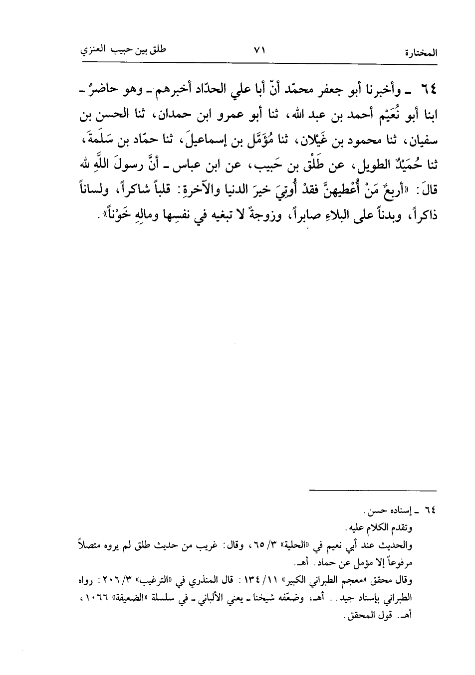 ٦٤ - وَأَخْبَرَنَا أَبُو جَعْفَرٍ مُحَمَّدٌ أَنَّ أَبَا عَلِيٍّ الْحَدَّادَ أَخْبَرَهُمْ - وَهُوَ حَاضِرٌ - أَبْنَا أَبُو نُعَيْمٍ أَحْمَدُ بْنُ عَبْدِ اللهِ، ثَنَا أَبُو عَمْرِو بْنُ حَمْدَانَ، ثَنَا الْحَسَنُ بْنُ سُفْيَانَ، ثَنَا مَحْمُودُ بْنُ غَيْلَانَ، ثَنَا مُؤَمَّلُ بْنُ إِسْمَاعِيلَ، ثَنَا حَمَّادُ بْنُ سَلَمَةَ، ثَنَا حُمَيْدٌ الطَّوِيلُ، عَنْ طَلْقِ بْنِ حَبِيبٍ، عَنِ ابْنِ عَبَّاسٍ، أَنَّ رَسُولَ اللهِ - صَلَّى اللهُ عَلَيْهِ وَسَلَّمَ - قَالَ: «أَرْبَعٌ مَنْ أُعْطِيَهُنَّ فَقَدْ أُوتِيَ خَيْرَ الدُّنْيَا وَالْآخِرَةِ: قَلْبًا شَاكِرًا، وَلِسَانًا ذَاكِرًا، وَبَدَنًا عَلَى الْبَلَاءِ صَابِرًا، وَزَوْجَةً لَا تَبْغِيهِ فِي نَفْسِهَا وَمَالِهِ خَوْنًا».
