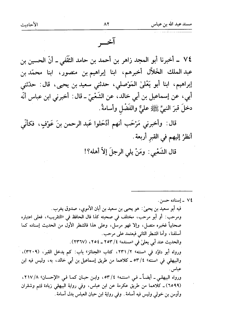 ٧٤ - أَخْبَرَنَا أَبُو الْمَجْدِ زَاهِرُ بْنُ أَحْمَدَ بْنِ حَامِدٍ الثَّقَفِيُّ، أَنَّ الْحُسَيْنَ بْنَ عَبْدِ الْمَلِكِ الْخَلَّالَ أَخْبَرَهُمْ، أَبْنَا إِبْرَاهِيمُ بْنُ مَنْصُورٍ، أَبْنَا مُحَمَّدُ بْنُ إِبْرَاهِيمَ، أَبْنَا أَبُو يَعْلَى الْمَوْصِلِيُّ، حَدَّثَنِي سَعِيدُ بْنُ يَحْيَى، قَالَ: حَدَّثَنِي أَبِي، عَنْ إِسْمَاعِيلَ بْنِ أَبِي خَالِدٍ، عَنِ الشَّعْبِيِّ قَالَ: أَخْبَرَنِي ابْنُ عَبَّاسٍ «أَنَّهُ دَخَلَ قَبْرَ النَّبِيِّ - صَلَّى اللهُ عَلَيْهِ وَسَلَّمَ - عَلِيٌّ وَالْفَضْلُ وَأُسَامَةُ. قَالَ: وَأَخْبَرَنِي مَرْحَبٌ أَنَّهُمْ أَدْخَلُوا عَبْدَ الرَّحْمَنِ بْنَ عَوْفٍ، فَكَأَنِّي أَنْظُرُ إِلَيْهِمْ فِي الْقَبْرِ أَرْبَعَةً».