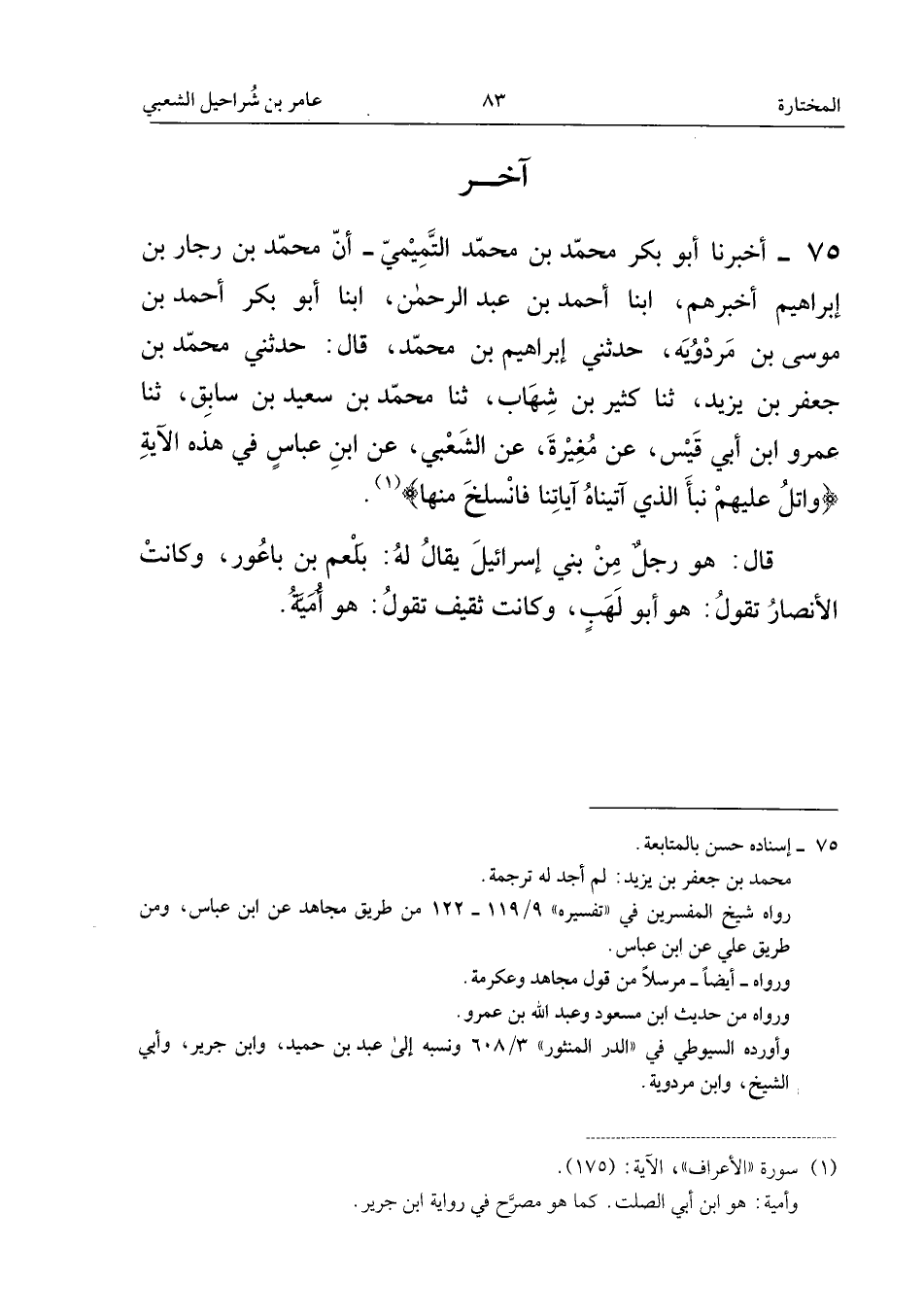 ٧٥ - أَخْبَرَنَا أَبُو بَكْرٍ مُحَمَّدُ بْنُ مُحَمَّدٍ التَّمِيمِيُّ، أَنَّ مُحَمَّدَ بْنَ رَجَاءِ بْنِ إِبْرَاهِيمَ أَخْبَرَهُمْ، أَبْنَا أَحْمَدُ بْنُ عَبْدِ الرَّحْمَنِ، أَبْنَا أَبُو بَكْرٍ أَحْمَدُ بْنُ مُوسَى بْنِ مَرْدُوَيْهِ، حَدَّثَنِي إِبْرَاهِيمُ بْنُ مُحَمَّدٍ، قَالَ: حَدَّثَنِي مُحَمَّدُ بْنُ جَعْفَرِ بْنِ يَزِيدَ، ثَنَا كَثِيرُ بْنُ شِهَابٍ، ثَنَا مُحَمَّدُ بْنُ سَعِيدِ بْنِ سَابِقٍ، ثَنَا عَمْرُو بْنُ أَبِي قَيْسٍ، عَنْ مُغِيرَةَ، عَنِ الشَّعْبِيِّ، عَنِ ابْنِ عَبَّاسٍ «فِي هَذِهِ الْآيَةِ: {وَاتْلُ عَلَيْهِمْ نَبَأَ الَّذِي آتَيْنَاهُ آيَاتِنَا فَانْسَلَخَ مِنْهَا}. قَالَ: هُوَ رَجُلٌ مِنْ بَنِي إِسْرَائِيلَ يُقَالُ لَهُ: بَلْعَمُ بْنُ بَاعُورَ، وَكَانَتِ الْأَنْصَارُ تَقُولُ: هُوَ أَبُو لَهَبٍ، وَكَانَتْ ثَقِيفُ تَقُولُ: هُوَ أُمَيَّةُ».