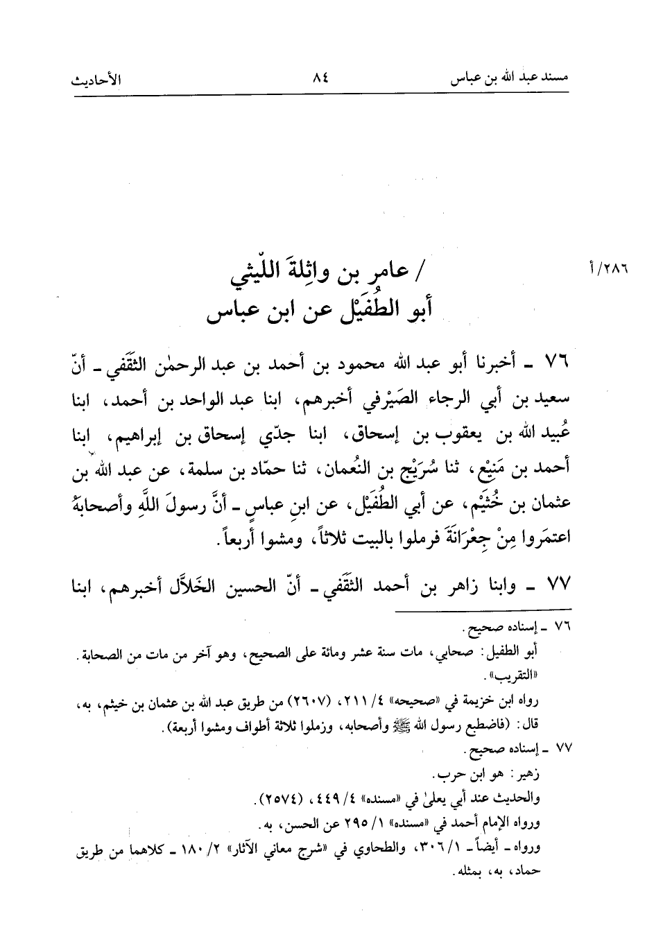 ٧٦ - أَخْبَرَنَا أَبُو عَبْدِ اللهِ مَحْمُودُ بْنُ أَحْمَدَ بْنِ عَبْدِ الرَّحْمَنِ الثَّقَفِيُّ، أَنَّ سَعِيدَ بْنَ أَبِي الرَّجَاءِ الصَّيْرَفِيَّ أَخْبَرَهُمْ، أَبْنَا عَبْدُ الْوَاحِدِ بْنُ أَحْمَدَ، أَبْنَا عُبَيْدُ اللهِ بْنُ يَعْقُوبَ بْنِ إِسْحَاقَ، أَبْنَا جَدِّي إِسْحَاقُ بْنُ إِبْرَاهِيمَ، أَبْنَا أَحْمَدُ بْنُ مَنِيعٍ، ثَنَا سُرَيْجُ بْنُ النُّعْمَانِ، ثَنَا حَمَّادُ بْنُ سَلَمَةَ، عَنْ عَبْدِ اللهِ بْنِ عُثْمَانَ بْنِ خُثَيْمٍ، عَنْ أَبِي الطُّفَيْلِ، عَنِ ابْنِ عَبَّاسٍ، «أَنَّ رَسُولَ اللهِ وَأَصْحَابَهُ اعْتَمَرُوا مِنْ جِعْرَانَةَ فَرَمَلُوا بِالْبَيْتِ ثَلَاثًا، وَمَشَوْا أَرْبَعًا».