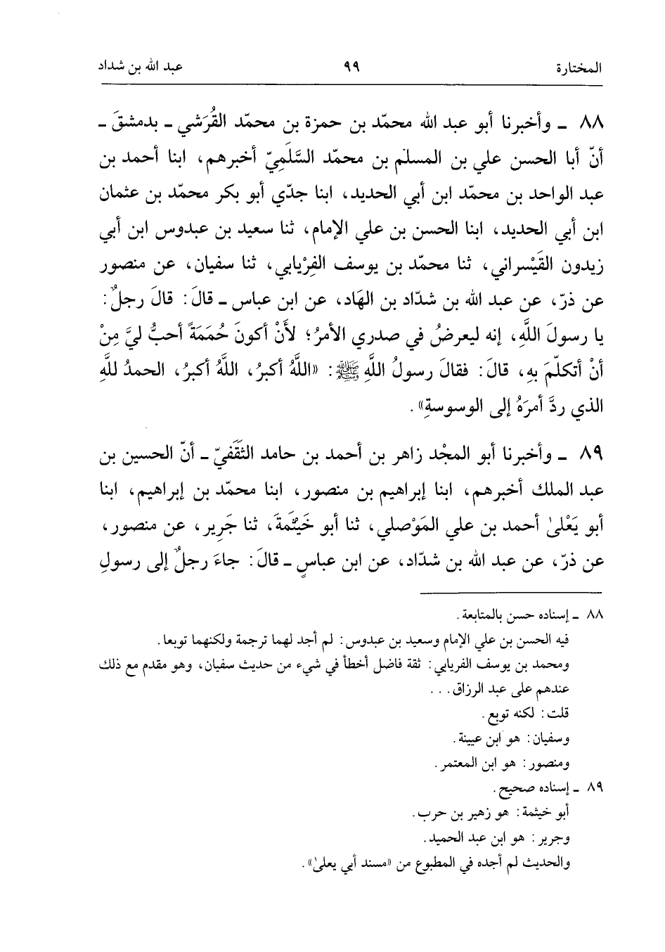٨٨ - وَأَخْبَرَنَا أَبُو عَبْدِ اللهِ مُحَمَّدُ بْنُ حَمْزَةَ بْنِ مُحَمَّدٍ الْقُرَشِيُّ - بِدِمَشْقَ - أَنَّ أَبَا الْحَسَنِ عَلِيَّ بْنَ الْمُسْلِمِ بْنِ مُحَمَّدٍ السُّلَمِيَّ أَخْبَرَهُمْ، أَبْنَا أَحْمَدُ بْنُ عَبْدِ الْوَاحِدِ بْنِ مُحَمَّدِ بْنِ أَبِي الْحَدِيدِ، أَبْنَا جَدِّي أَبُو بَكْرٍ مُحَمَّدُ بْنُ عُثْمَانَ بْنِ أَبِي الْحَدِيدِ، أَبْنَا الْحَسَنُ بْنُ عَلِيٍّ الْإِمَامُ، ثَنَا سَعِيدُ بْنُ عُبْدُوسِ بْنِ أَبِي زَيْدُونَ الْقَيْسَرَانِيُّ، ثَنَا مُحَمَّدُ بْنُ يُوسُفَ الْفِرْيَابِيُّ، ثَنَا سُفْيَانُ، عَنْ مَنْصُورٍ عَنْ ذَرٍّ، عَنْ عَبْدِ اللهِ بْنِ شَدَّادِ بْنِ الْهَادِ، عَنِ ابْنِ عَبَّاسٍ قَالَ: «قَالَ رَجُلٌ: يَا رَسُولَ اللهِ، إِنَّهُ لَيَعْرِضُ فِي صَدْرِي الْأَمْرُ، لَأَنْ أَكُونَ حُمَمَةً أَحَبُّ لِي مِنْ أَنْ أَتَكَلَّمَ بِهِ، قَالَ: فَقَالَ رَسُولُ اللهِ - صَلَّى اللهُ عَلَيْهِ وَسَلَّمَ -: اللهُ أَكْبَرُ، اللهُ أَكْبَرُ، الْحَمْدُ لِلهِ الَّذِي رَدَّ أَمْرَهُ إِلَى الْوَسْوَسَةِ».