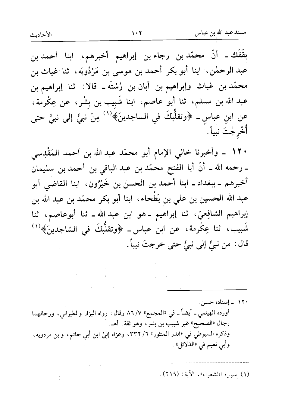 ١٢٠ - وَأَخْبَرَنَا خَالِيَ الْإِمَامُ أَبُو مُحَمَّدٍ عَبْدُ اللهِ بْنُ أَحْمَدَ الْمَقْدِسِيُّ - رَحِمَهُ اللهُ - أَنَّ أَبَا الْفَتْحِ مُحَمَّدَ بْنَ عَبْدِ الْبَاقِي بْنِ أَحْمَدَ بْنِ سُلَيْمَانَ أَخْبَرَهُمْ - بِبَغْدَادَ - أَبْنَا أَحْمَدُ بْنُ الْحَسَنِ بْنِ خَيْرُونٍ، أَبْنَا الْقَاضِي أَبُو عَبْدِ اللهِ الْحُسَيْنُ بْنُ عَلِيِّ بْنِ بَطْحَاءَ، أَبْنَا أَبُو بَكْرٍ مُحَمَّدُ بْنُ عَبْدِ اللهِ بْنِ إِبْرَاهِيمَ الشَّافِعِيُّ، ثَنَا إِبْرَاهِيمُ - هُوَ ابْنُ عَبْدِ اللهِ - ثَنَا أَبُو عَاصِمٍ، ثَنَا شَبِيبٌ، ثَنَا عِكْرِمَةُ، عَنِ ابْنِ عَبَّاسٍ - «{وَتَقَلُّبَكَ فِي السَّاجِدِينَ}: مِنْ نَبِيٍّ إِلَى نَبِيٍّ حَتَّى خَرَجْتَ نَبِيًّا».