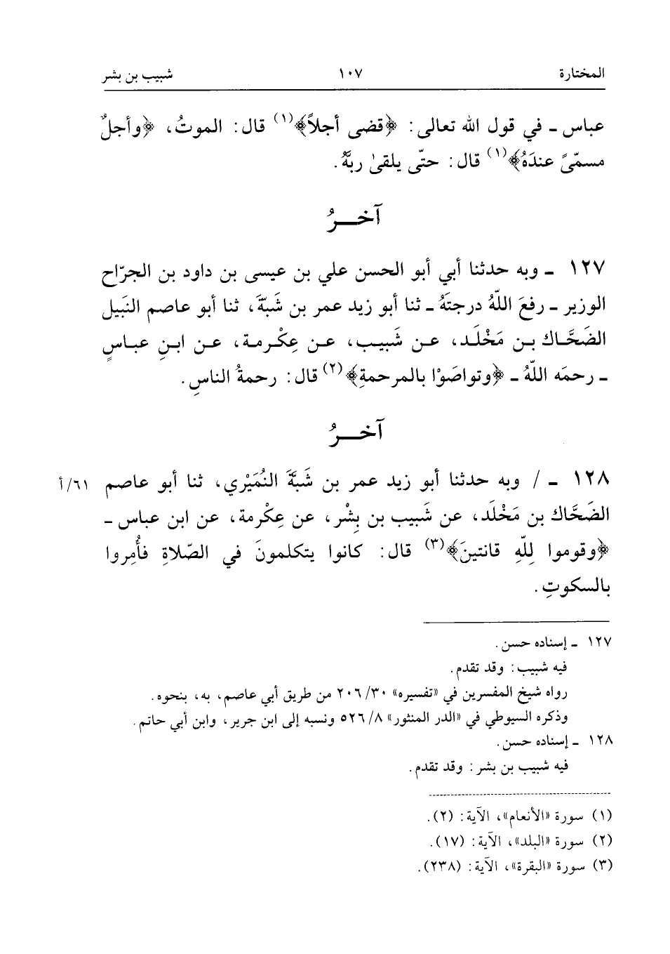 ١٢٨ - وَبِهِ حَدَّثَنَا أَبُو زَيْدٍ عُمَرُ بْنُ شَبَّةَ النُّمَيْرِيُّ، ثَنَا أَبُو عَاصِمٍ الضَّحَّاكُ بْنُ مَخْلَدٍ، عَنْ شَبِيبِ بْنِ بِشْرٍ، عَنْ عِكْرِمَةَ، عَنِ ابْنِ عَبَّاسٍ - «{وَقُومُوا لِلهِ قَانِتِينَ}. قَالَ: كَانُوا يَتَكَلَّمُونَ فِي الصَّلَاةِ فَأُمِرُوا بِالسُّكُوتِ».