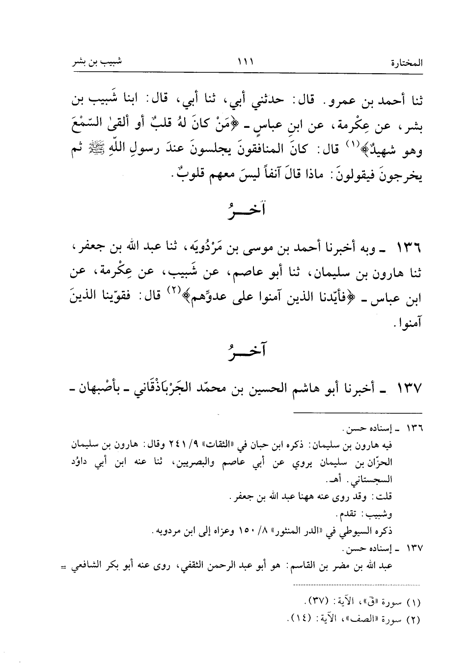 ١٣٦ - وَبِهِ أَخْبَرَنَا أَحْمَدُ بْنُ مُوسَى بْنِ مَرْدُوَيْهِ، ثَنَا عَبْدُ اللهِ بْنُ جَعْفَرٍ، ثَنَا هَارُونُ بْنُ سُلَيْمَانَ، ثَنَا أَبُو عَاصِمٍ، عَنْ شَبِيبٍ، عَنْ عِكْرِمَةَ، عَنِ ابْنِ عَبَّاسٍ - «{فَأَيَّدْنَا الَّذِينَ آمَنُوا عَلَى عَدُوِّهِمْ}، قَالَ: فَقَوَّيْنَا الَّذِينَ آمَنُوا».