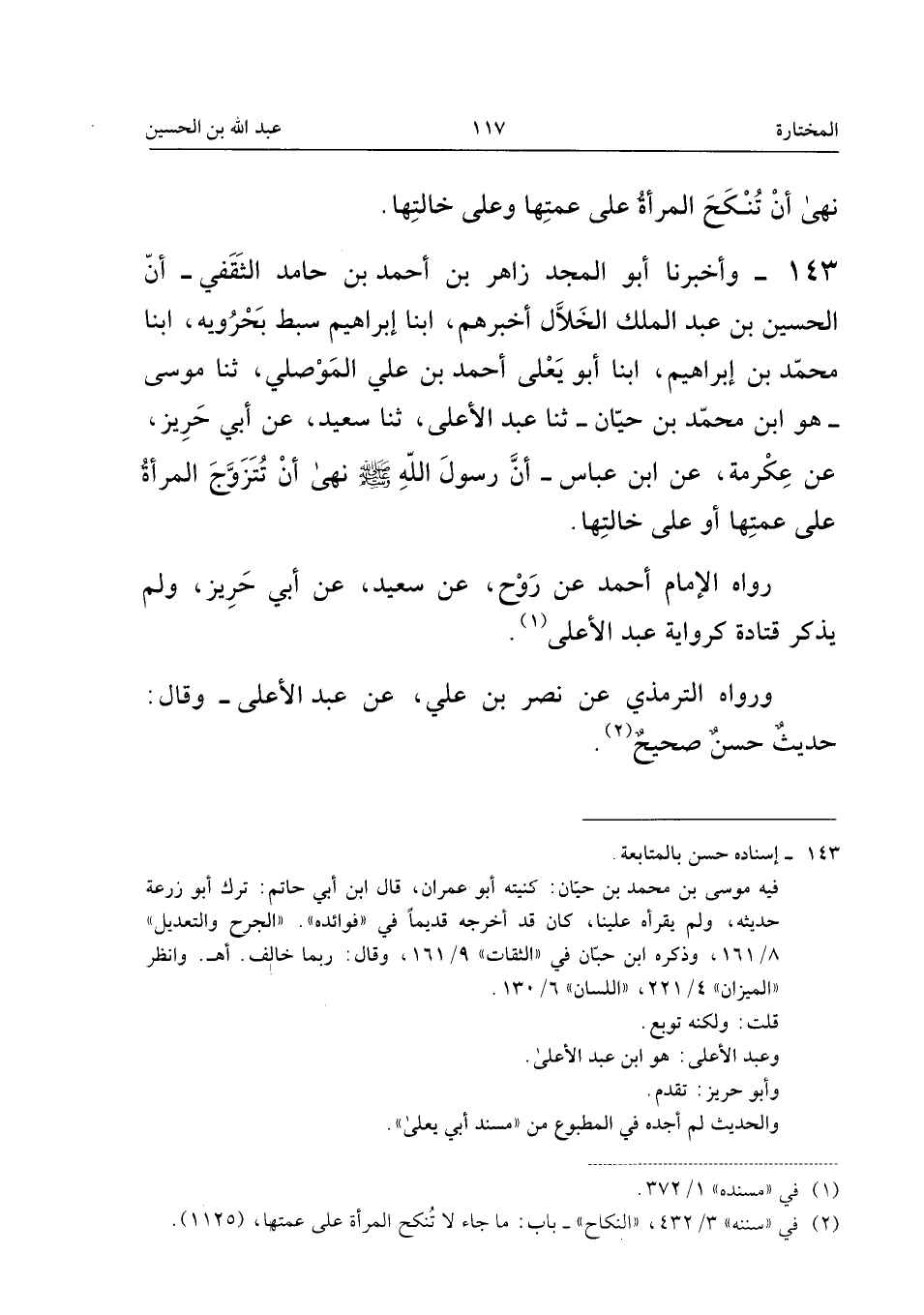 ١٤٣ - وَأَخْبَرَنَا أَبُو الْمَجْدِ زَاهِرُ بْنُ أَحْمَدَ بْنِ حَامِدٍ الثَّقَفِيُّ، أَنَّ الْحُسَيْنَ بْنَ عَبْدِ الْمَلِكِ الْخَلَّالَ أَخْبَرَهُمْ، أَبْنَا إِبْرَاهِيمُ سِبْطُ بَحْرَوَيْهِ، أَبْنَا مُحَمَّدُ بْنُ إِبْرَاهِيمَ، أَبْنَا أَبُو يَعْلَى أَحْمَدُ بْنُ عَلِيٍّ الْمَوْصِلِيُّ، ثَنَا مُوسَى - هُوَ ابْنُ مُحَمَّدِ بْنِ حَيَّانَ - ثَنَا عَبْدُ الْأَعْلَى، ثَنَا سَعِيدٌ، عَنْ أَبِي حَرِيزٍ، عَنْ عِكْرِمَةَ، عَنِ ابْنِ عَبَّاسٍ: أَنَّ رَسُولَ اللهِ - صَلَّى اللهُ عَلَيْهِ وَسَلَّمَ - «نَهَى أَنْ تَتَزَوَّجَ الْمَرْأَةُ عَلَى عَمَّتِهَا أَوْ عَلَى خَالَتِهَا».
