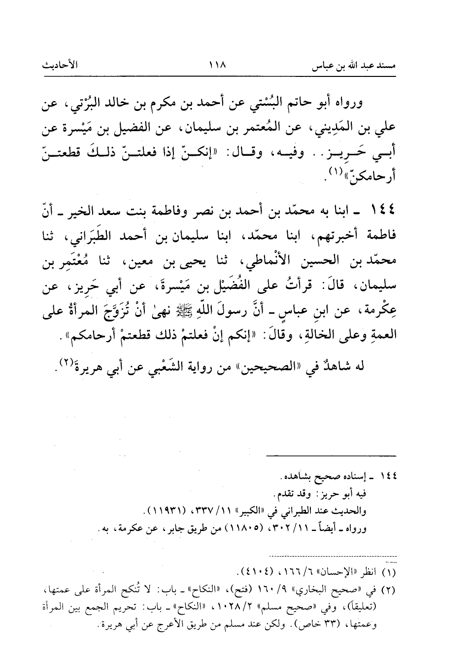 ١٤٤ - أَبْنَا بِهِ مُحَمَّدُ بْنُ أَحْمَدَ بْنِ نَصْرٍ وَفَاطِمَةُ بِنْتُ سَعْدِ الْخَيْرِ، أَنَّ فَاطِمَةَ أَخْبَرَتْهُمْ، أَبْنَا مُحَمَّدٌ، أَبْنَا سُلَيْمَانُ بْنُ أَحْمَدَ الطَّبَرَانِيُّ، ثَنَا مُحَمَّدُ بْنُ الْحُسَيْنِ الْأَنْمَاطِيُّ، ثَنَا يَحْيَى بْنُ مَعِينٍ، ثَنَا مُعْتَمِرُ بْنُ سُلَيْمَانَ، قَالَ: قَرَأْتُ عَلَى الْفُضَيْلِ بْنِ مَيْسَرَةَ، عَنْ أَبِي حَرِيزٍ، عَنْ عِكْرِمَةَ، عَنِ ابْنِ عَبَّاسٍ، أَنَّ رَسُولَ اللهِ - صَلَّى اللهُ عَلَيْهِ وَسَلَّمَ - «نَهَى أَنْ تُزَوَّجَ الْمَرْأَةُ عَلَى الْعَمَّةِ وَعَلَى الْخَالَةِ، وَقَالَ: إِنَّكُمْ إِنْ فَعَلْتُمْ ذَلِكَ قَطَعْتُمْ أَرْحَامَكُمْ».