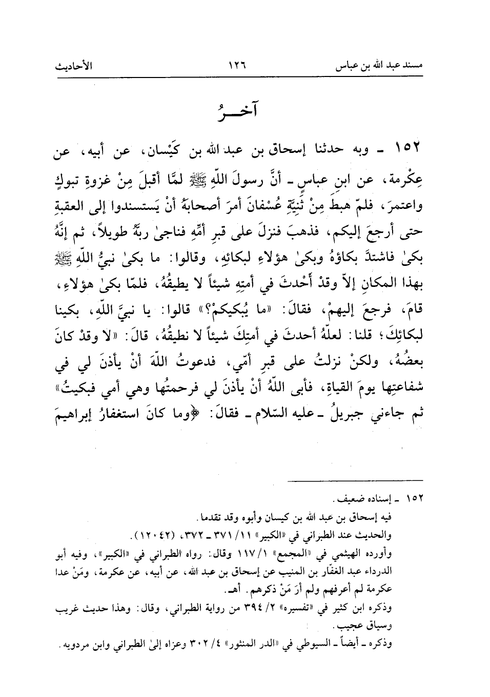 ١٥٢ - وَبِهِ حَدَّثَنَا إِسْحَاقُ بْنُ عَبْدِ اللهِ بْنِ كَيْسَانَ، عَنْ أَبِيهِ، عَنْ عِكْرِمَةَ، عَنِ ابْنِ عَبَّاسٍ، «أَنَّ رَسُولَ اللهِ - صَلَّى اللهُ عَلَيْهِ وَسَلَّمَ - لَمَّا أَقْبَلَ مِنْ غَزْوَةِ تَبُوكَ وَاعْتَمَرَ، فَلَمَّا هَبَطَ مِنْ ثَنِيَّةِ عُسْفَانَ أَمَرَ أَصْحَابَهُ أَنْ يَسْتَسْنِدُوا إِلَى الْعَقَبَةِ حَتَّى أَرْجِعَ إِلَيْكُمْ، فَذَهَبَ فَنَزَلَ عَلَى قَبْرِ أُمِّهِ فَنَاجَى رَبَّهُ طَوِيلًا، ثُمَّ إِنَّهُ بَكَى فَاشْتَدَّ بُكَاؤُهُ وَبَكَى هَؤُلَاءِ لِبُكَائِهِ، وَقَالُوا: مَا بَكَى نَبِيُّ اللهِ - صَلَّى اللهُ عَلَيْهِ وَسَلَّمَ - بِهَذَا الْمَكَانِ إِلَّا وَقَدْ أَحْدَثَ فِي أُمَّتِهِ شَيْئًا لَا يُطِيقُهُ، فَلَمَّا بَكَى هَؤُلَاءِ، قَامَ، فَرَجَعَ إِلَيْهِمْ، فَقَالَ: مَا يُبْكِيكُمْ؟ قَالُوا: يَا نَبِيَّ اللهِ بَكَيْنَا لِبُكَائِكَ؛ قُلْنَا: لَعَلَّهُ أَحْدَثَ فِي أُمَّتِكَ شَيْئًا لَا نُطِيقُهُ، قَالَ: لَا، وَقَدْ كَانَ بَعْضُهُ، وَلَكِنْ نَزَلْتُ عَلَى قَبْرِ أُمِّي، فَدَعَوْتُ اللهَ أَنْ يَأْذَنَ لِي فِي شَفَاعَتِهَا يَوْمَ الْقِيَامَةِ، فَأَبَى اللهُ أَنْ يَأْذَنَ لِي فَرَحِمْتُهَا وَهِيَ أُمِّي فَبَكَيْتُ ثُمَّ جَاءَنِي جِبْرِيلُ - عَلَيْهِ السَّلَامُ - فَقَالَ: {وَمَا كَانَ اسْتِغْفَارُ إِبْرَاهِيمَ لأَبِيهِ إِلا عَنْ مَوْعِدَةٍ وَعَدَهَا إِيَّاهُ فَلَمَّا تَبَيَّنَ لَهُ أَنَّهُ عَدُوٌّ لِلهِ تَبَرَّأَ مِنْهُ}.