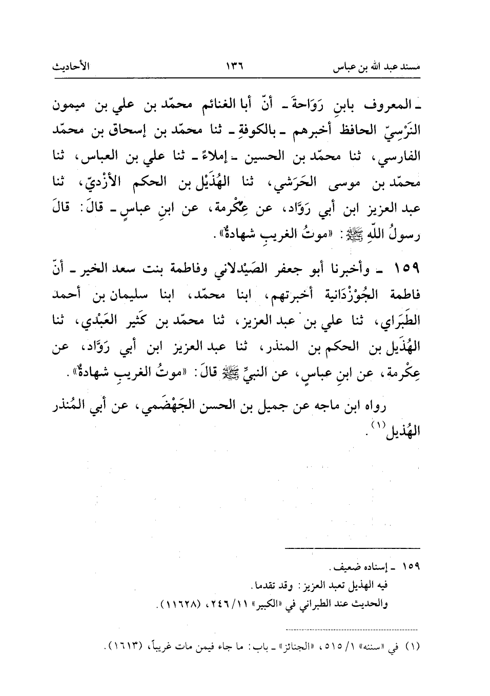 ١٥٩ - وَأَخْبَرَنَا أَبُو جَعْفَرٍ الصَّيْدَلَانِيُّ وَفَاطِمَةُ بِنْتُ سَعْدِ الْخَيْرِ، أَنَّ فَاطِمَةَ الْجُوزْدَانِيَّةَ أَخْبَرَتْهُمْ، أَبْنَا مُحَمَّدٌ، أَبْنَا سُلَيْمَانُ بْنُ أَحْمَدَ الطَّبَرَانِيُّ (¬١)، ثَنَا عَلِيُّ بْنُ عَبْدِ الْعَزِيزِ، ثَنَا مُحَمَّدُ بْنُ كَثِيرٍ الْعَبْدِيُّ، ثَنَا الْهُذَيْلُ بْنُ الْحَكَمِ بْنِ الْمُنْذِرِ، ثَنَا عَبْدُ الْعَزِيزِ ابْنُ أَبِي رَوَّادٍ، عَنْ عِكْرِمَةَ، عَنِ ابْنِ عَبَّاسٍ، عَنِ النَّبِيِّ - صَلَّى اللهُ عَلَيْهِ وَسَلَّمَ، قَالَ: «مَوْتُ الْغَرِيبِ شَهَادَةٌ».