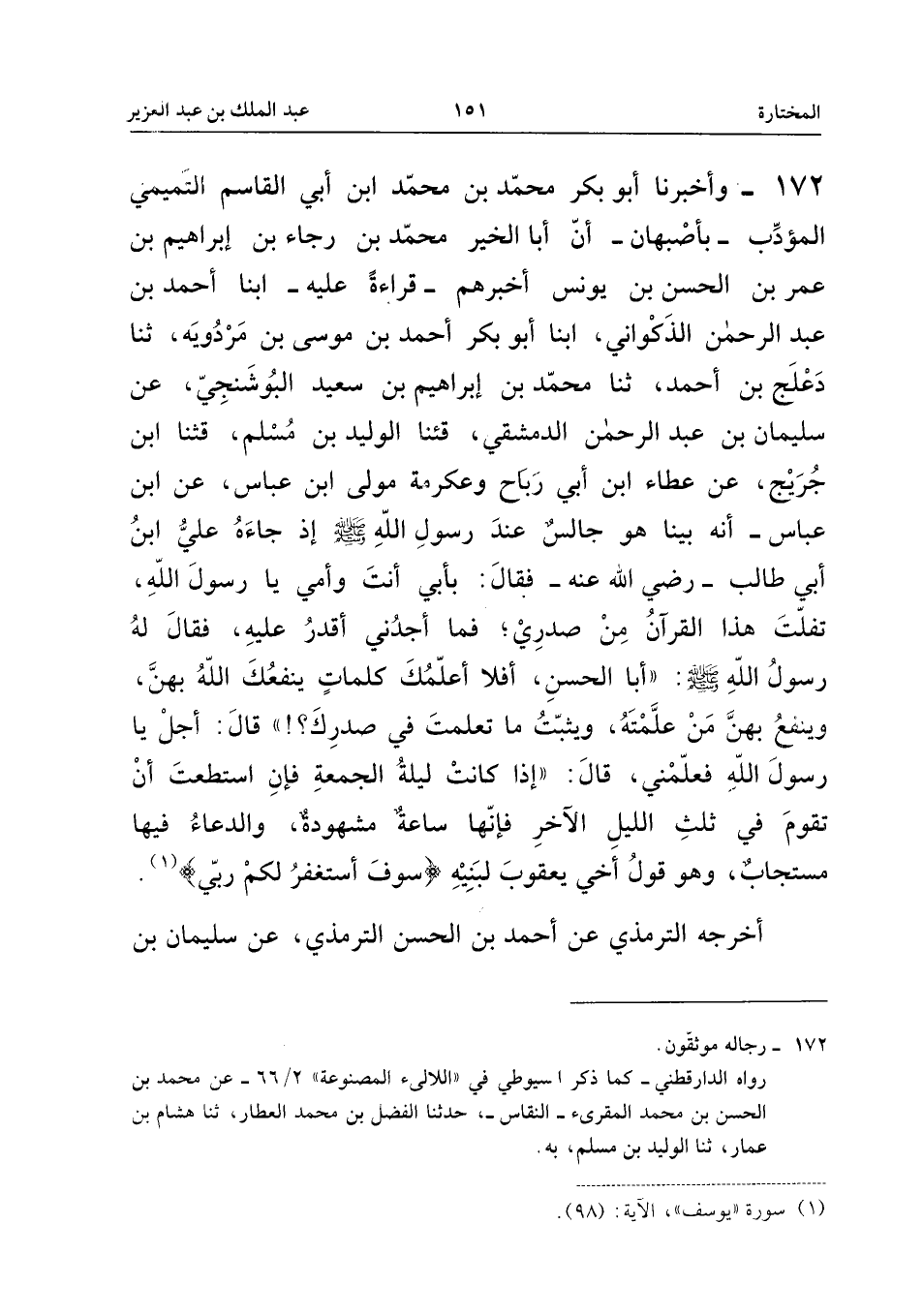 ١٧٢ - وَأَخْبَرَنَا أَبُو بَكْرٍ مُحَمَّدُ بْنُ مُحَمَّدِ ابْنِ أَبِي الْقَاسِمِ التَّمِيمِيُّ الْمُؤَدِّبُ - بِأَصْبَهَانَ - أَنَّ أَبَا الْخَيْرِ مُحَمَّدَ بْنَ رَجَاءِ بْنِ إِبْرَاهِيمَ بْنِ عُمَرَ بْنِ الْحَسَنِ بْنِ يُونُسَ أَخْبَرَهُمْ - قِرَاءَةً عَلَيْهِ - أَبْنَا أَحْمَدُ بْنُ عَبْدِ الرَّحْمَنِ الذَّكْوَانِيُّ، أَبْنَا أَبُو بَكْرٍ أَحْمَدُ بْنُ مُوسَى بْنِ مَرْدُوَيْهِ، ثَنَا دَعْلَجُ بْنُ أَحْمَدَ، ثَنَا مُحَمَّدُ بْنُ إِبْرَاهِيمَ بْنِ سَعِيدٍ الْبُوشَنْجِيُّ، عَنْ سُلَيْمَانَ بْنِ عَبْدِ الرَّحْمَنِ الدِّمَشْقِيِّ، قَثَنَا الْوَلِيدُ بْنُ مُسْلِمٍ، قَثَنَا ابْنُ جُرَيْجٍ، عَنْ عَطَاءِ ابْنِ أَبِي رَبَاحٍ وَعِكْرِمَةَ مَوْلَى ابْنِ عَبَّاسٍ، عَنِ ابْنِ عَبَّاسٍ: «أَنَّهُ بَيْنَا هُوَ جَالِسٌ عِنْدَ رَسُولِ اللهِ - صَلَّى اللهُ عَلَيْهِ وَسَلَّمَ - إِذْ جَاءَهُ عَلِيُّ بْنُ أَبِي طَالِبٍ - رَضِيَ اللهُ عَنْهُ - فَقَالَ: بِأَبِي أَنْتَ وَأُمِّي يَا رَسُولَ اللهِ، تَفَلَّتَ هَذَا الْقُرْآنُ مِنْ صَدْرِي؛ فَمَا أَجِدُنِي أَقْدِرُ عَلَيْهِ، فَقَالَ لَهُ رَسُولُ اللهِ صَلَّى اللهُ عَلَيْهِ وَسَلَّمَ: أَبَا الْحَسَنِ، أَفَلَا أُعَلِّمُكَ كَلِمَاتٍ يَنْفَعُكَ اللهُ بِهِنَّ، وَيَنْفَعُ بِهِنَّ مَنْ عَلَّمْتَهُ، وَيَثْبُتُ مَا تَعَلَّمْتَ فِي صَدْرِكَ! قَالَ: أَجَلْ يَا رَسُولَ اللهِ فَعَلِّمْنِي، قَالَ: إِذَا كَانَتْ لَيْلَةُ الْجُمُعَةِ فَإِنِ اسْتَطَعْتَ أَنْ تَقُومَ فِي ثُلُثِ اللَّيْلِ الْآخِرِ فَإِنَّهَا سَاعَةٌ مَشْهُودَةٌ، وَالدُّعَاءُ فِيهَا مُسْتَجَابٌ، وَهُوَ قَوْلُ أَخِي يَعْقُوبَ لِبَنِيهِ {سَوْفَ أَسْتَغْفِرُ لَكُمْ رَبِّي}».
