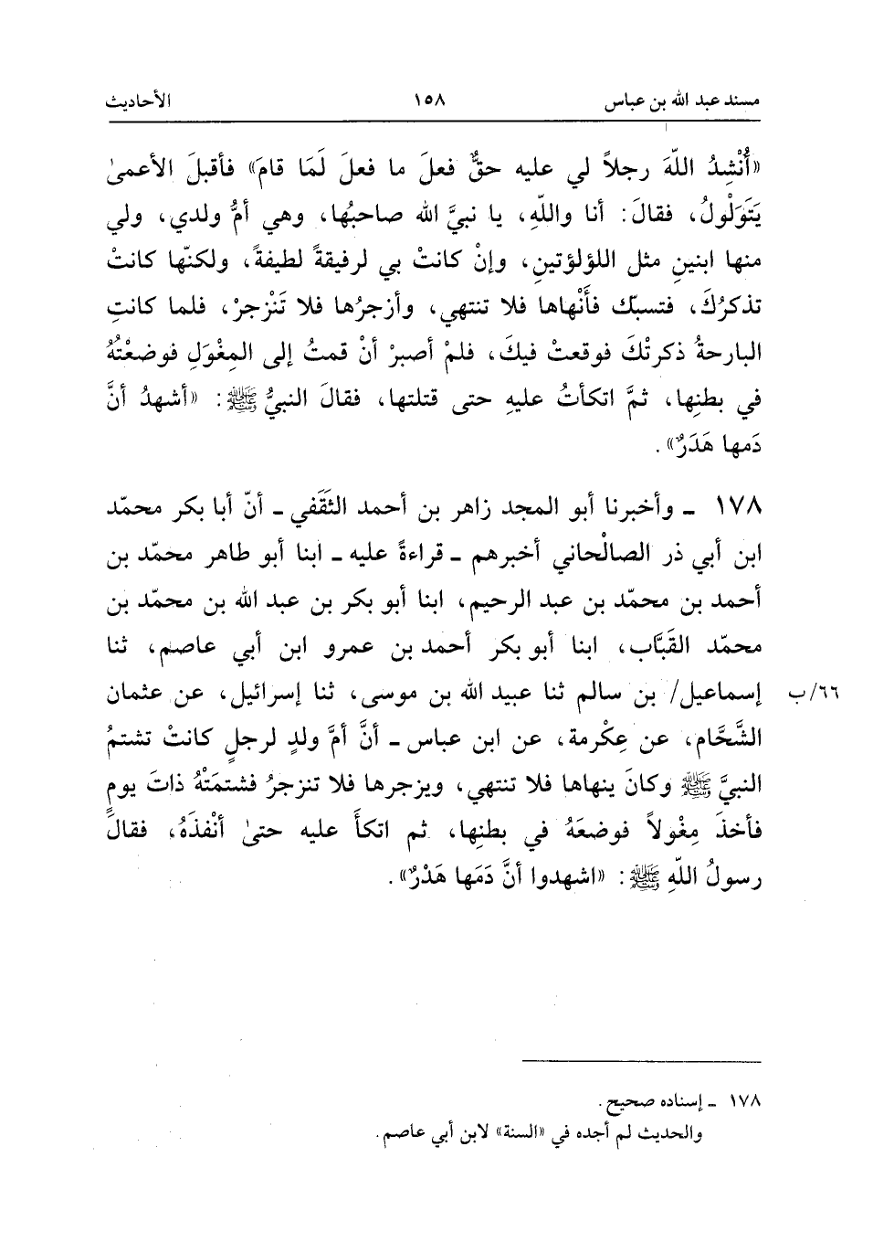 ١٧٨ - وَأَخْبَرَنَا أَبُو الْمَجْدِ زَاهِرُ بْنُ أَحْمَدَ الثَّقَفِيُّ، أَنَّ أَبَا بَكْرٍ مُحَمَّدَ ابْنَ أَبِي ذَرٍّ الصَّالْحَانِيَّ أَخْبَرَهُمْ - قِرَاءَةً عَلَيْهِ - أَبْنَا أَبُو طَاهِرٍ مُحَمَّدُ بْنُ أَحْمَدَ بْنِ مُحَمَّدِ بْنِ عَبْدِ الرَّحِيمِ، أَبْنَا أَبُو بَكْرِ بْنُ عَبْدِ اللهِ بْنِ مُحَمَّدِ بْنِ مُحَمَّدٍ الْقَبَّابُ، أَبْنَا أَبُو بَكْرٍ أَحْمَدُ بْنُ عَمْرِو ابْنِ أَبِي عَاصِمٍ، ثَنَا إِسْمَاعِيلُ بْنُ سَالِمٍ ثَنَا عُبَيْدُ اللهِ بْنُ مُوسَى، ثَنَا إِسْرَائِيلُ، عَنْ عُثْمَانَ الشَّحَّامِ، عَنْ عِكْرِمَةَ، عَنِ ابْنِ عَبَّاسٍ: «أَنَّ أُمَّ وَلَدٍ لِرَجُلٍ كَانَتْ تَشْتُمُ النَّبِيَّ - صَلَّى اللهُ عَلَيْهِ وَسَلَّمَ - وَكَانَ يَنْهَاهَا فَلَا تَنْتَهِي، وَيَزْجُرُهَا فَلَا تَنْزَجِرُ، فَشَتَمَتْهُ ذَاتَ يَوْمٍ فَأَخَذَ مِغْوَلًا فَوَضَعَهُ فِي بَطْنِهَا، ثُمَّ اتَّكَأَ عَلَيْهِ حَتَّى أَنْفَذَهُ، فَقَالَ رَسُولُ اللهِ صَلَّى اللهُ عَلَيْهِ وَسَلَّمَ: اشْهَدُوا أَنَّ دَمَهَا هَدَرٌ».