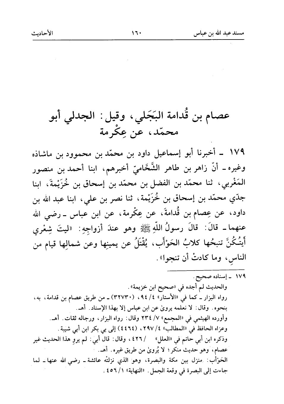 ١٧٩ - أَخْبَرَنَا أَبُو إِسْمَاعِيلَ دَاوُدُ بْنُ مُحَمَّدِ بْنِ مَحْمُودِ بْنِ مَاشَاذَهْ وَغَيْرُهُ، أَنَّ زَاهِرَ بْنَ طَاهِرٍ الشَّحَّامِيَّ أَخْبَرَهُمْ، أَبْنَا أَحْمَدُ بْنُ مَنْصُورٍ الْمَغْرِبِيُّ، ثَنَا مُحَمَّدُ بْنُ الْفَضْلِ بْنِ مُحَمَّدِ بْنِ إِسْحَاقَ بْنِ خُزَيْمَةَ، أَبْنَا جَدِّي مُحَمَّدُ بْنُ إِسْحَاقَ بْنِ خُزَيْمَةَ، ثَنَا نَصْرُ بْنُ عَلِيٍّ، أَبْنَا عَبْدُ اللهِ بْنُ دَاوُدَ، عَنْ عِصَامِ بْنِ قُدَامَةَ، عَنْ عِكْرِمَةَ، عَنِ ابْنِ عَبَّاسٍ - رَضِيَ اللهُ عَنْهُمَا - قَالَ: قَالَ رَسُولُ اللهِ - صَلَّى اللهُ عَلَيْهِ وَسَلَّمَ - وَهُوَ عِنْدَ أَزْوَاجِهِ: «لَيْتَ شِعْرِي أَيَّتُكُنَّ تَنْبَحُهَا كِلَابُ الْحَوْأَبِ، يُقْتَلُ عَنْ يَمِينِهَا وَعَنْ شِمَالِهَا قِيَامٌ مِنَ النَّاسِ، وَمَا كَادَتْ أَنْ تَنْجُوَ».
