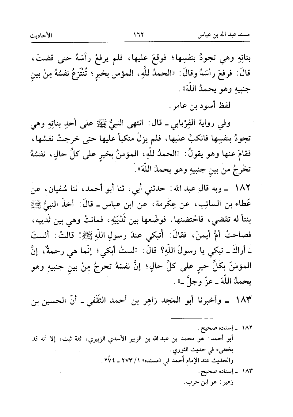 ١٨٢ - وَبِهِ، قَالَ عَبْدُ اللهِ: حَدَّثَنِي أَبِي، ثَنَا أَبُو أَحْمَدَ، ثَنَا سُفْيَانُ، عَنْ عَطَاءِ بْنِ السَّائِبِ، عَنْ عِكْرِمَةَ، عَنِ ابْنِ عَبَّاسٍ، قَالَ: «أَخَذَ النَّبِيُّ - صَلَّى اللهُ عَلَيْهِ وَسَلَّمَ - بِنْتًا لَهُ تَقْضِي، فَاحْتَضَنَهَا، فَوَضَعَهَا بَيْنَ ثَدْيَيْهِ، فَمَاتَتْ وَهِيَ بَيْنَ ثَدْيَيْهِ، فَصَاحَتْ أُمُّ أَيْمَنَ، فَقَالَ: أَتَبْكِي عِنْدَ رَسُولِ اللهِ صَلَّى اللهُ عَلَيْهِ وَسَلَّمَ! قَالَتْ: أَلَسْتُ أَرَاكَ تَبْكِي يَا رَسُولَ اللهِ؟ قَالَ: لَسْتُ أَبْكِي، إِنَّمَا هِيَ رَحْمَةٌ، إِنَّ الْمُؤْمِنَ بِكُلِّ خَيْرٍ عَلَى كُلِّ حَالٍ؛ إِنَّ نَفْسَهُ تَخْرُجُ مِنْ بَيْنِ جَنْبَيْهِ وَهُوَ يَحْمَدُ اللهَ عَزَّ وَجَلَّ».