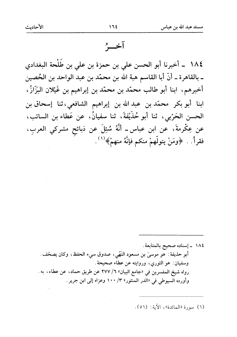 ١٨٤ - أَخْبَرَنَا أَبُو الْحَسَنِ عَلِيُّ بْنُ حَمْزَةَ بْنِ عَلِيِّ بْنِ طَلْحَةَ الْبَغْدَادِيُّ - بِالْقَاهِرَةِ - أَنَّ أَبَا الْقَاسِمِ هِبَةَ اللهِ بْنَ مُحَمَّدِ بْنِ عَبْدِ الْوَاحِدِ بْنِ الْحُصَيْنِ أَخْبَرَهُمْ، أَبْنَا أَبُو طَالِبٍ مُحَمَّدُ بْنُ مُحَمَّدِ بْنِ إِبْرَاهِيمَ بْنِ غَيْلَانَ الْبَزَّازُ، أَبْنَا أَبُو بَكْرٍ مُحَمَّدُ بْنُ عَبْدِ اللهِ بْنِ إِبْرَاهِيمَ الشَّافِعِيُّ، ثَنَا إِسْحَاقُ بْنُ الْحَسَنِ الْحَرْبِيُّ، ثَنَا أَبُو حُذَيْفَةَ، ثَنَا سُفْيَانُ، عَنْ عَطَاءِ بْنِ السَّائِبِ، عَنْ عِكْرِمَةَ، عَنِ ابْنِ عَبَّاسٍ: «أَنَّهُ سُئِلَ عَنْ ذَبَائِحِ مُشْرِكِي الْعَرَبِ، فَقَرَأَ: {وَمَنْ يَتَوَلَّهُمْ مِنْكُمْ فَإِنَّهُ مِنْهُمْ}».