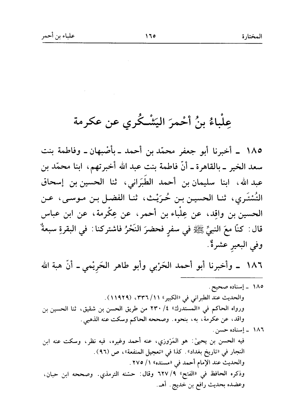 ١٨٥ - أَخْبَرَنَا أَبُو جَعْفَرٍ مُحَمَّدُ بْنُ أَحْمَدَ - بِأَصْبَهَانَ - وَفَاطِمَةُ بِنْتُ سَعْدِ الْخَيْرِ - بِالْقَاهِرَةِ - أَنَّ فَاطِمَةَ بِنْتَ عَبْدِ اللهِ أَخْبَرَتْهُمْ، أَبْنَا مُحَمَّدُ بْنُ عَبْدِ اللهِ، أَبْنَا سُلَيْمَانُ بْنُ أَحْمَدَ الطَّبَرَانِيُّ، ثَنَا الْحُسَيْنُ بْنُ إِسْحَاقَ التُّسْتَرِيُّ، ثَنَا الْحُسَيْنُ بْنُ حُرَيْثٍ، ثَنَا الْفَضْلُ بْنُ مُوسَى، عَنِ الْحُسَيْنِ بْنِ وَاقِدٍ، عَنْ عِلْبَاءَ بْنِ أَحْمَرَ، عَنْ عِكْرِمَةَ، عَنِ ابْنِ عَبَّاسٍ قَالَ: «كُنَّا مَعَ النَّبِيِّ - صَلَّى اللهُ عَلَيْهِ وَسَلَّمَ - فِي سَفَرٍ فَحَضَرَ النَّحْرُ فَاشْتَرَكْنَا فِي الْبَقَرَةِ سَبْعَةٌ، وَفِي الْبَعِيرِ عَشَرَةً».